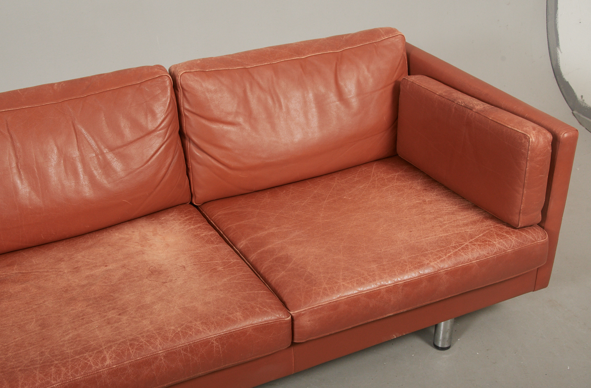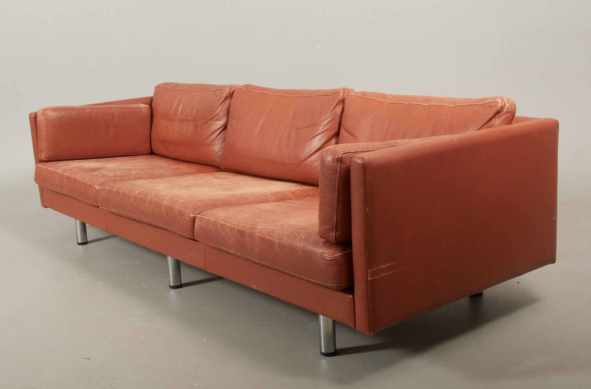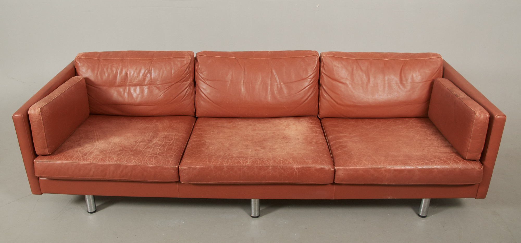 4-sitsig, läderklädda plymåer, längd 237 cm (specialbeställd), skinn med bruksslitage/slitage, fläckar förekommer.