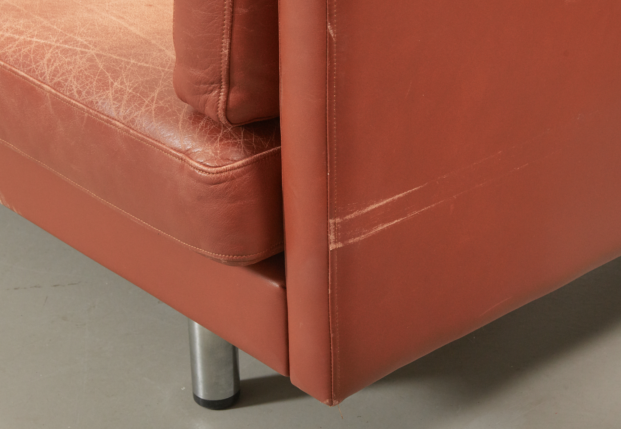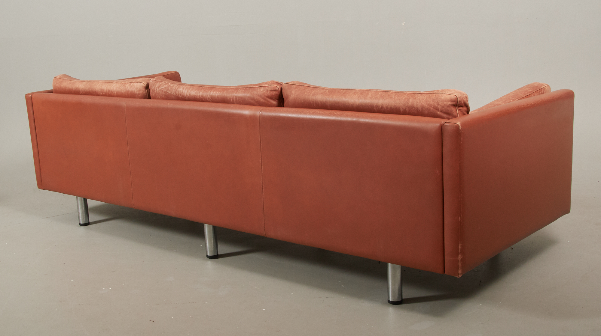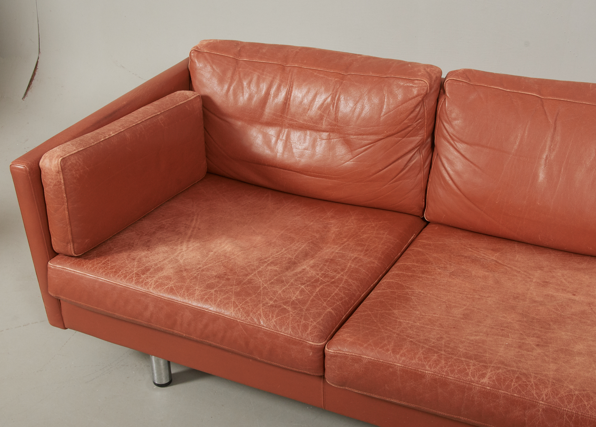 4-sitsig, läderklädda plymåer, längd 237 cm (specialbeställd), skinn med bruksslitage/slitage, fläckar förekommer.