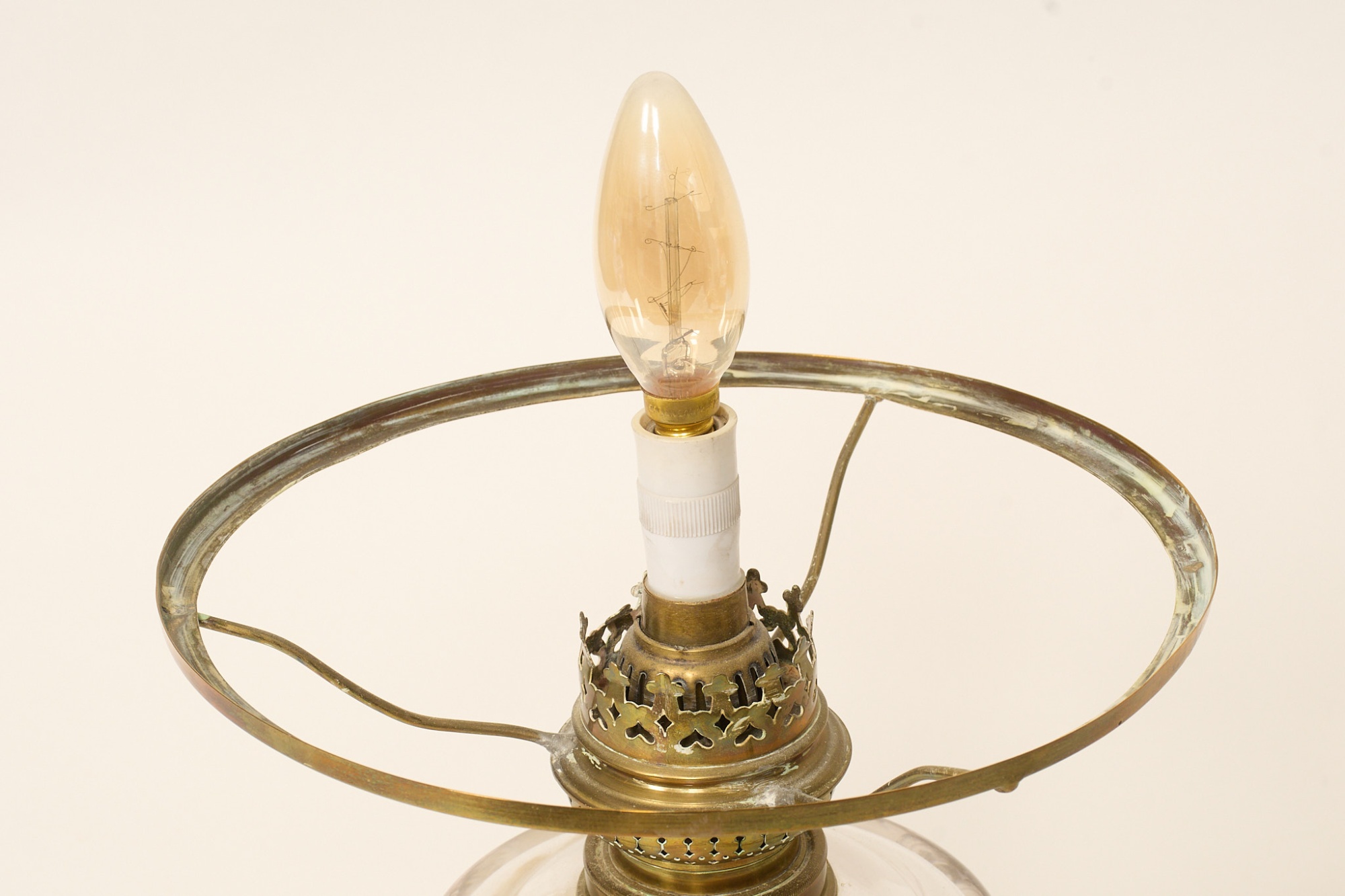 Fotogenlampa, senare elktrifierad, fot i gulmetall, kupa i opakt glas, höjd 46 cm, bruksslitage.
