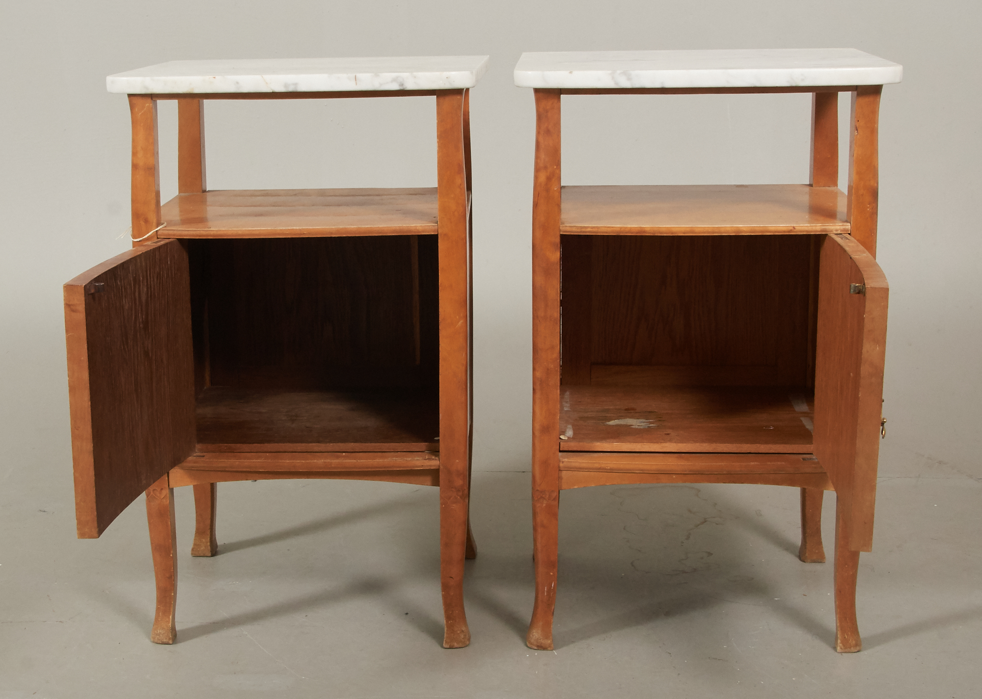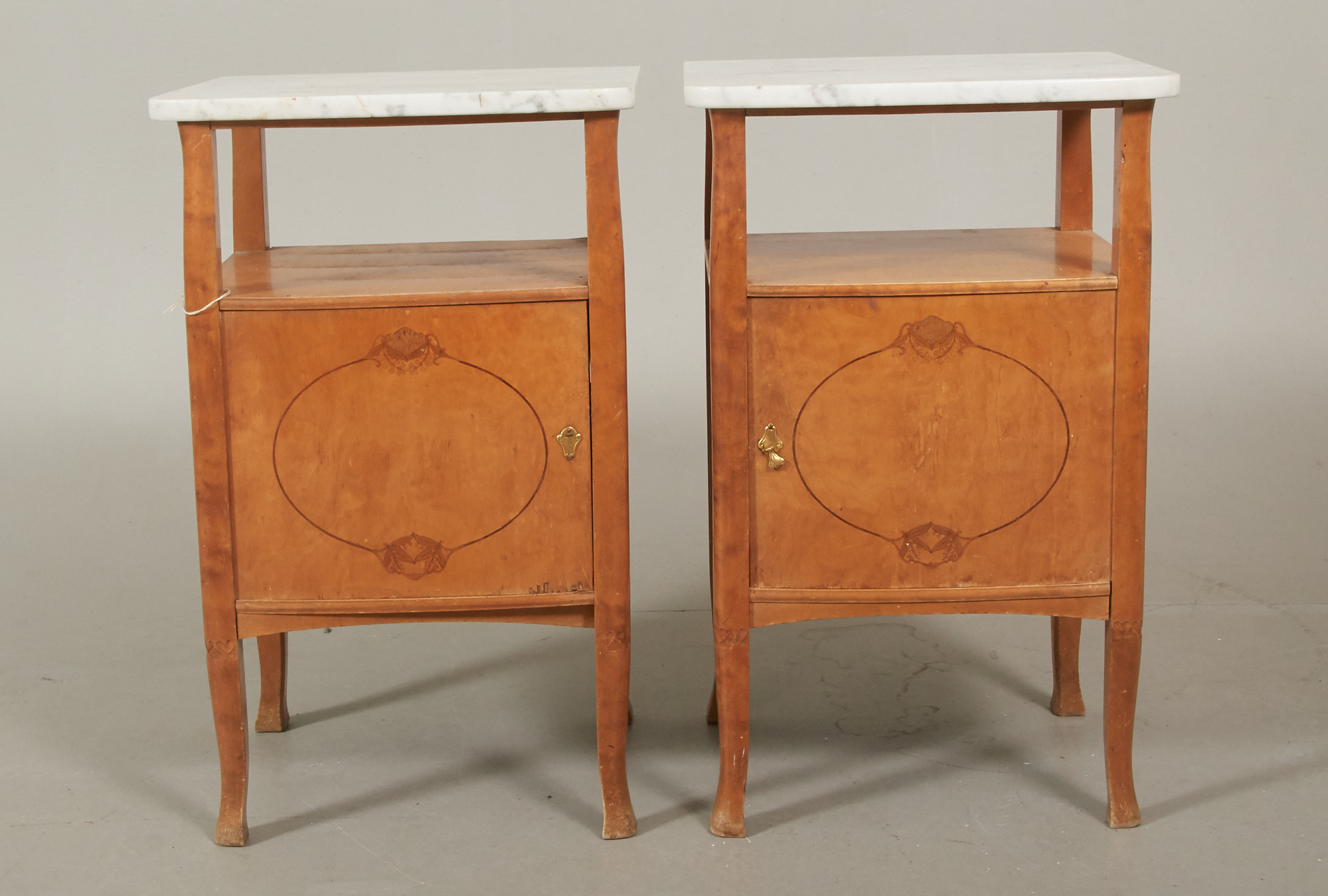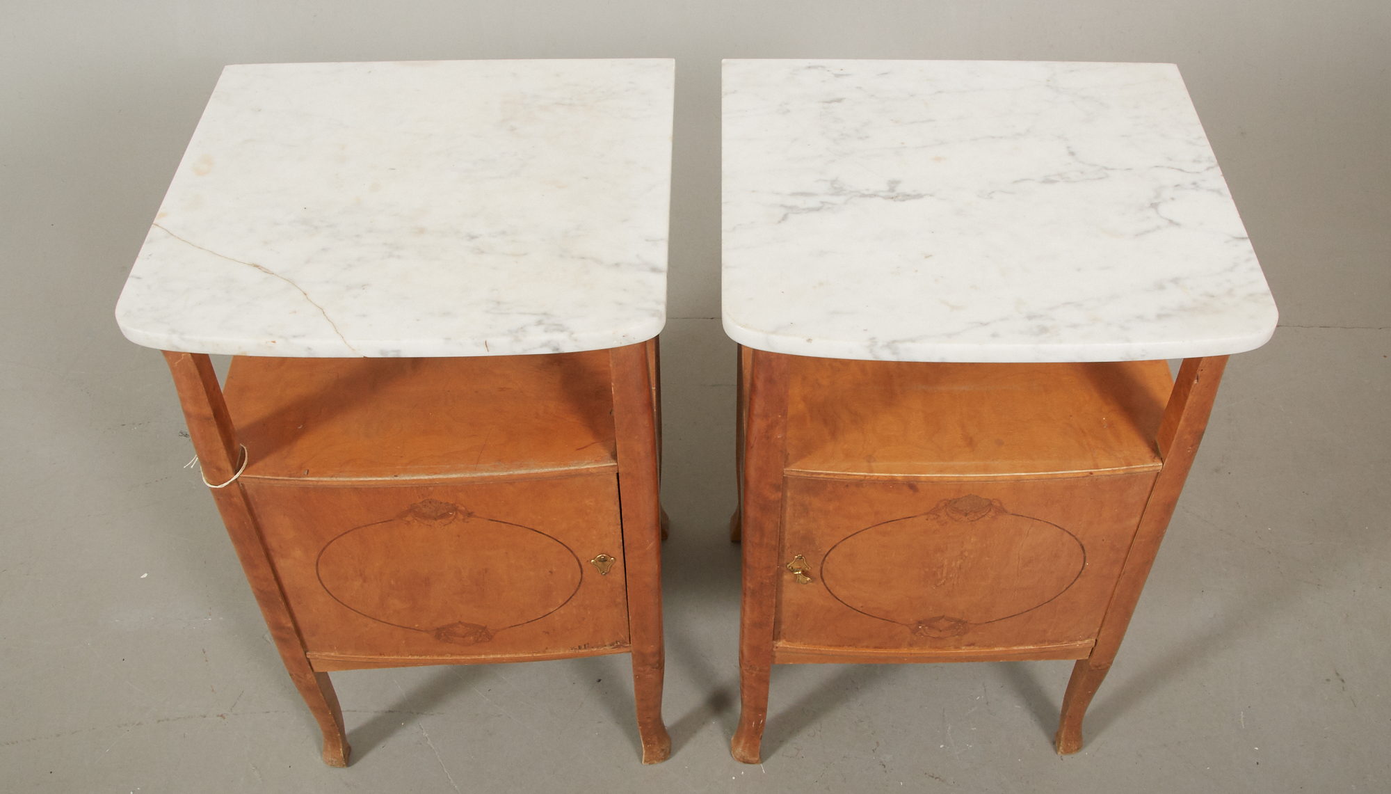 2 st, sängbord 43 x 38 cm, höjd ca 70 cm, en marmorskiva med lagning, ett beslag saknar ring, fläckar