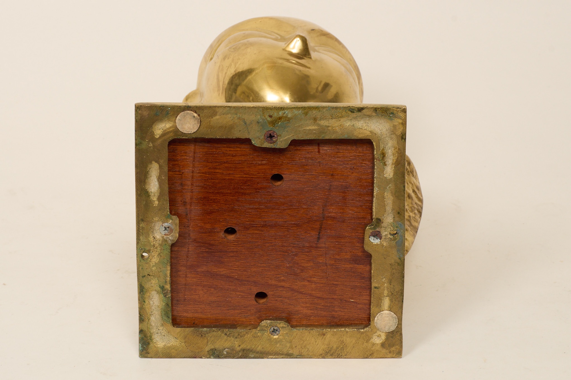 Mässing, höjd ca 43 cm ex träsockel. Slitage, fläckar, buckla i mässing.