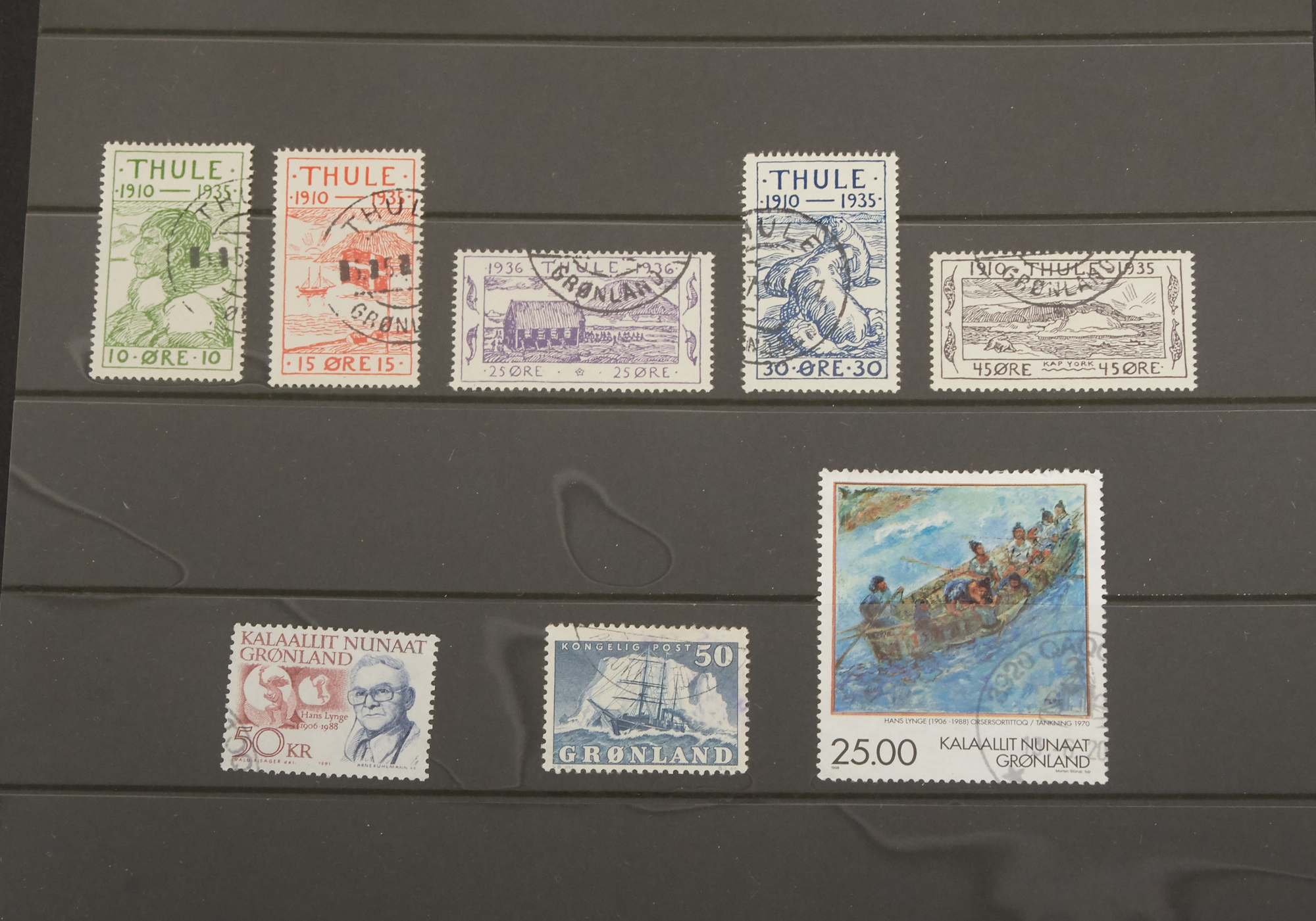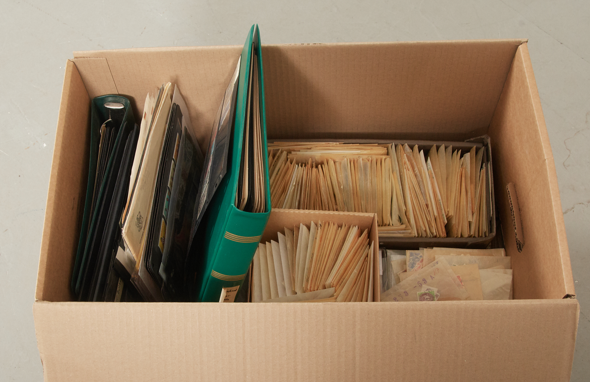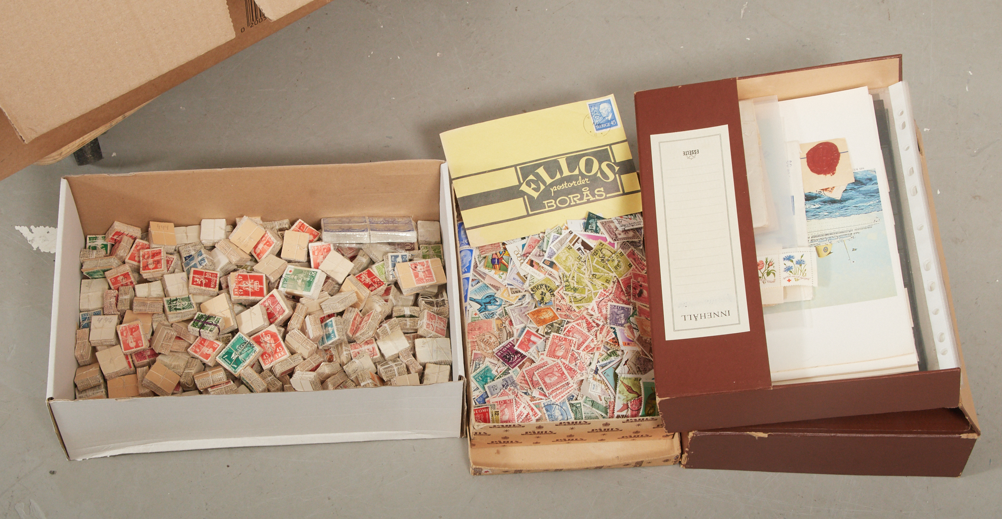 "Fyndlåda", samling Island, Grönland, Färöarna, Åland. 100 buntar H.V frimärken i pengamyntkuvert, brev mm.