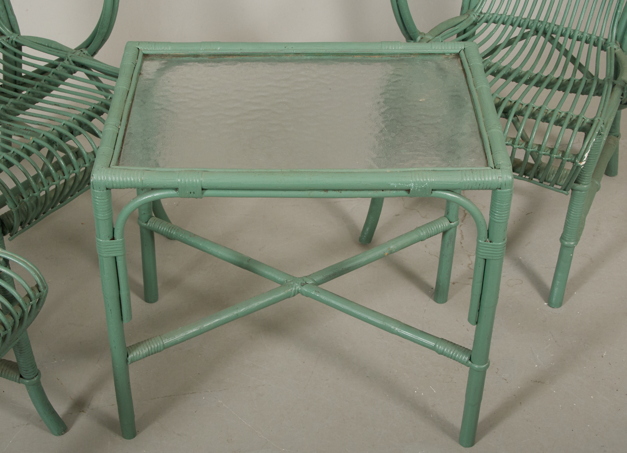 Bemålad, 3 stolar samt bord med glasskiva 60 x 40, höjd 58 cm. Bruksslitage, ett rottingrör skadat.