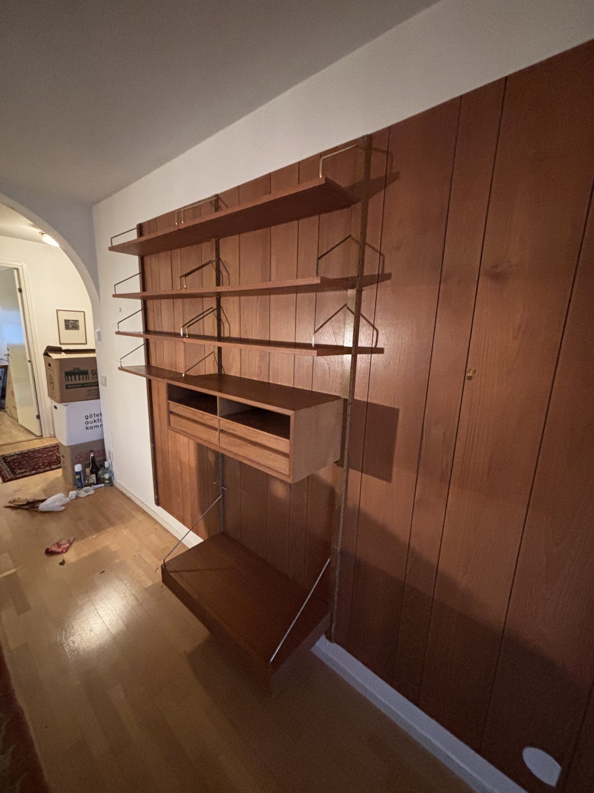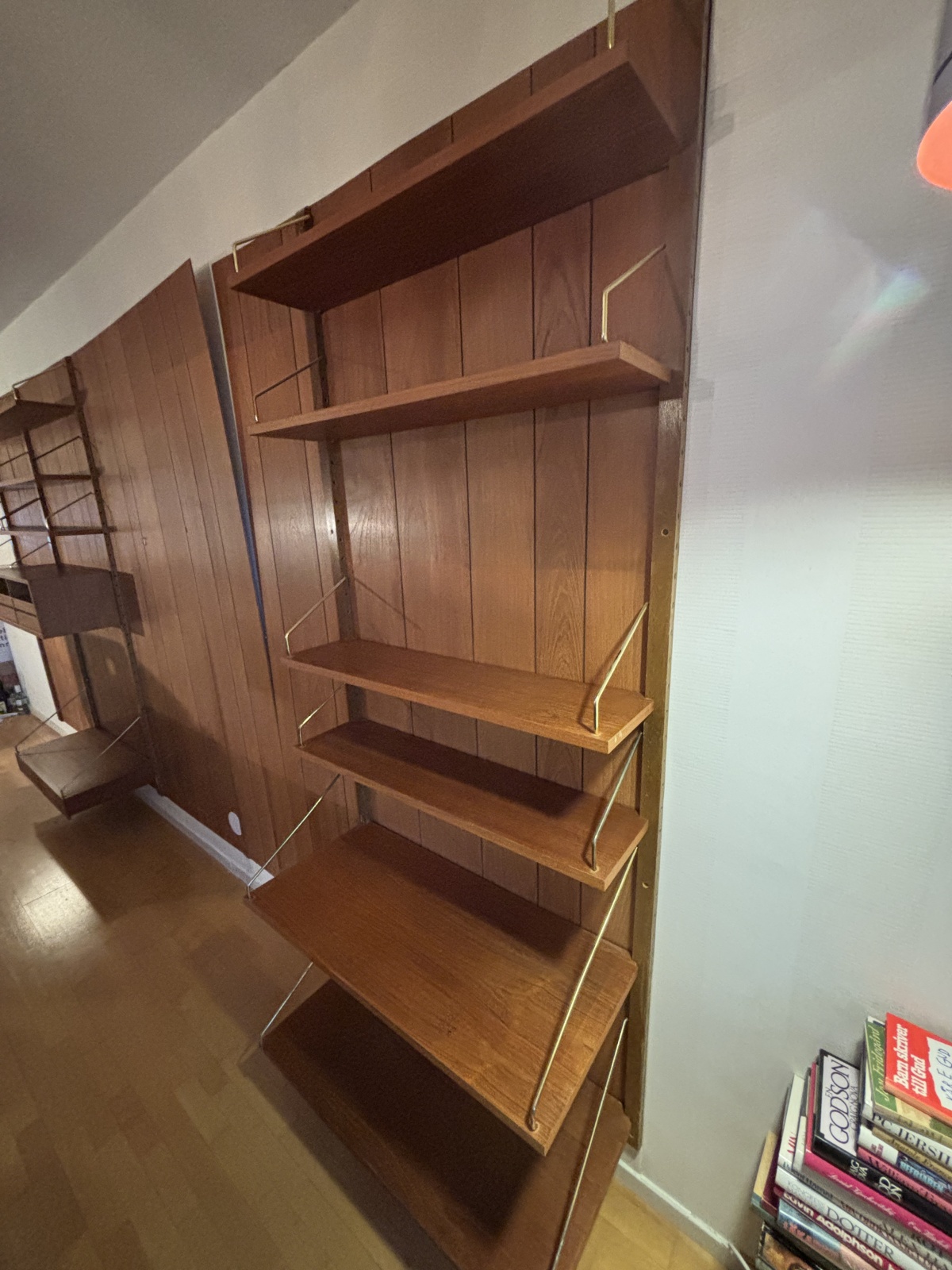 Teak,13 hyllplan 2 st 37 x 80, 11 29 x 80 cm, 2 moduler med lådor 80 x 37 cm samt 80 x 30 cm , 28 hyllbärare i mässing. Icke tillhörande bakstycke i teak med tapetrester, 3 sektioner, 207 x 122 cm. Bruksslitage.