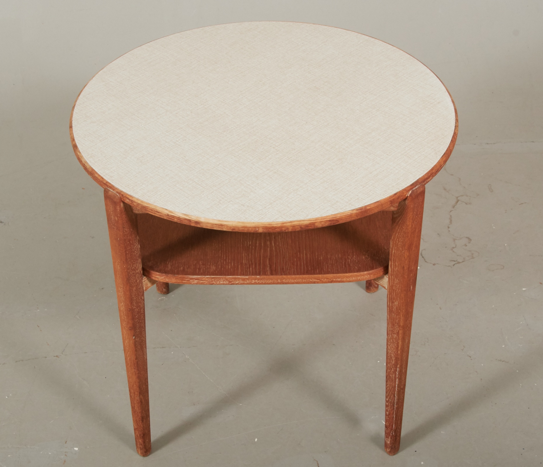 Sidobord ek med hylla undertill, diameter 60 cm, höjd 56 cm. Bruksslitage.