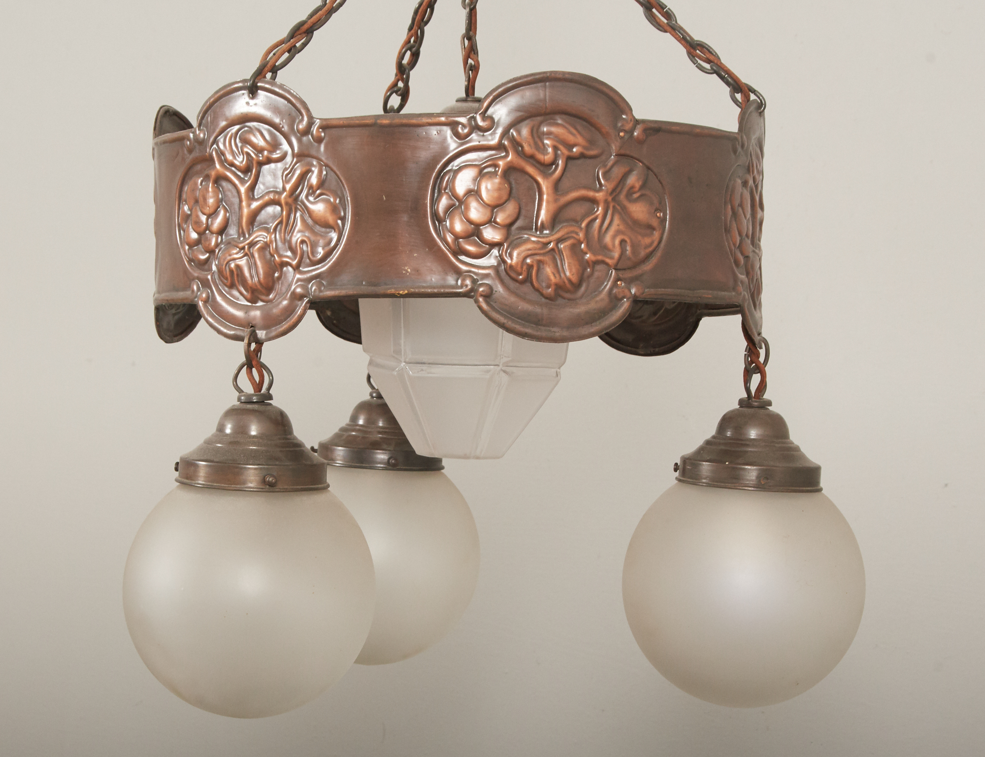 Koppar, med kupor i glas, en + 3 elektriska ljuspunkter, kupor i glas. (saknar några skruvar för att fästa kuporna). Diam 38 cm.