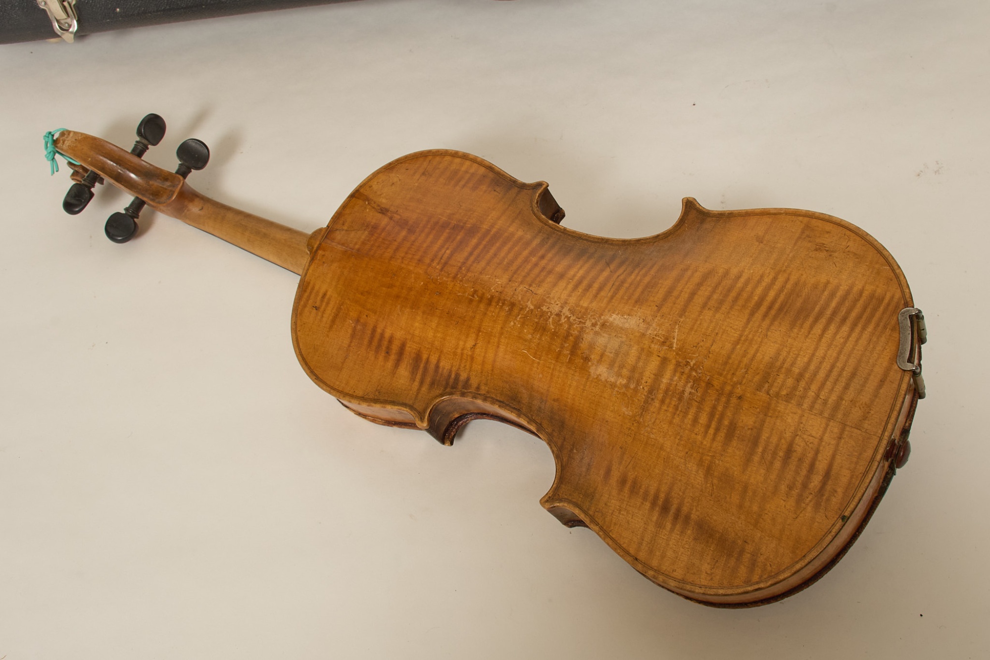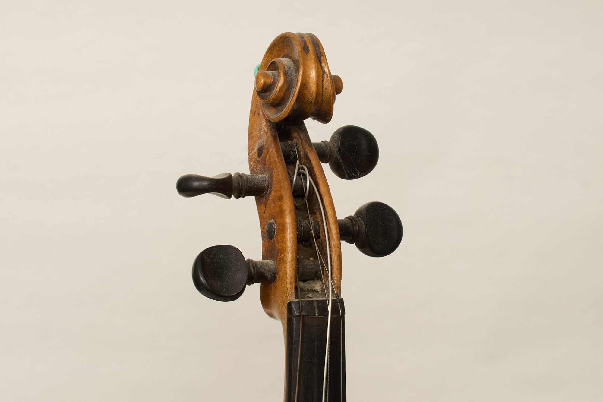 Fiol, med stråke, längd 60 cm, bruksslitage/slitage, stråke med lagning.