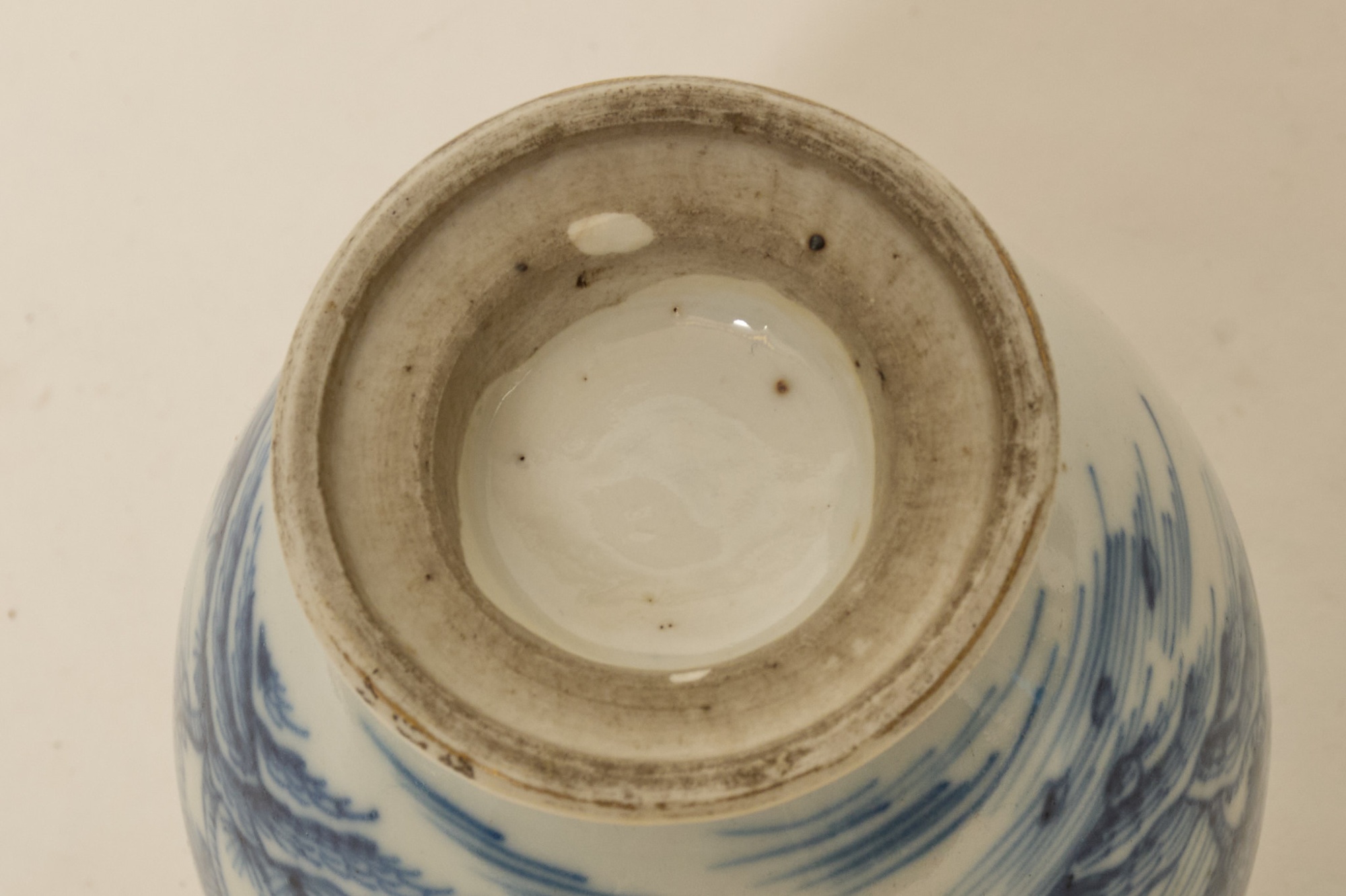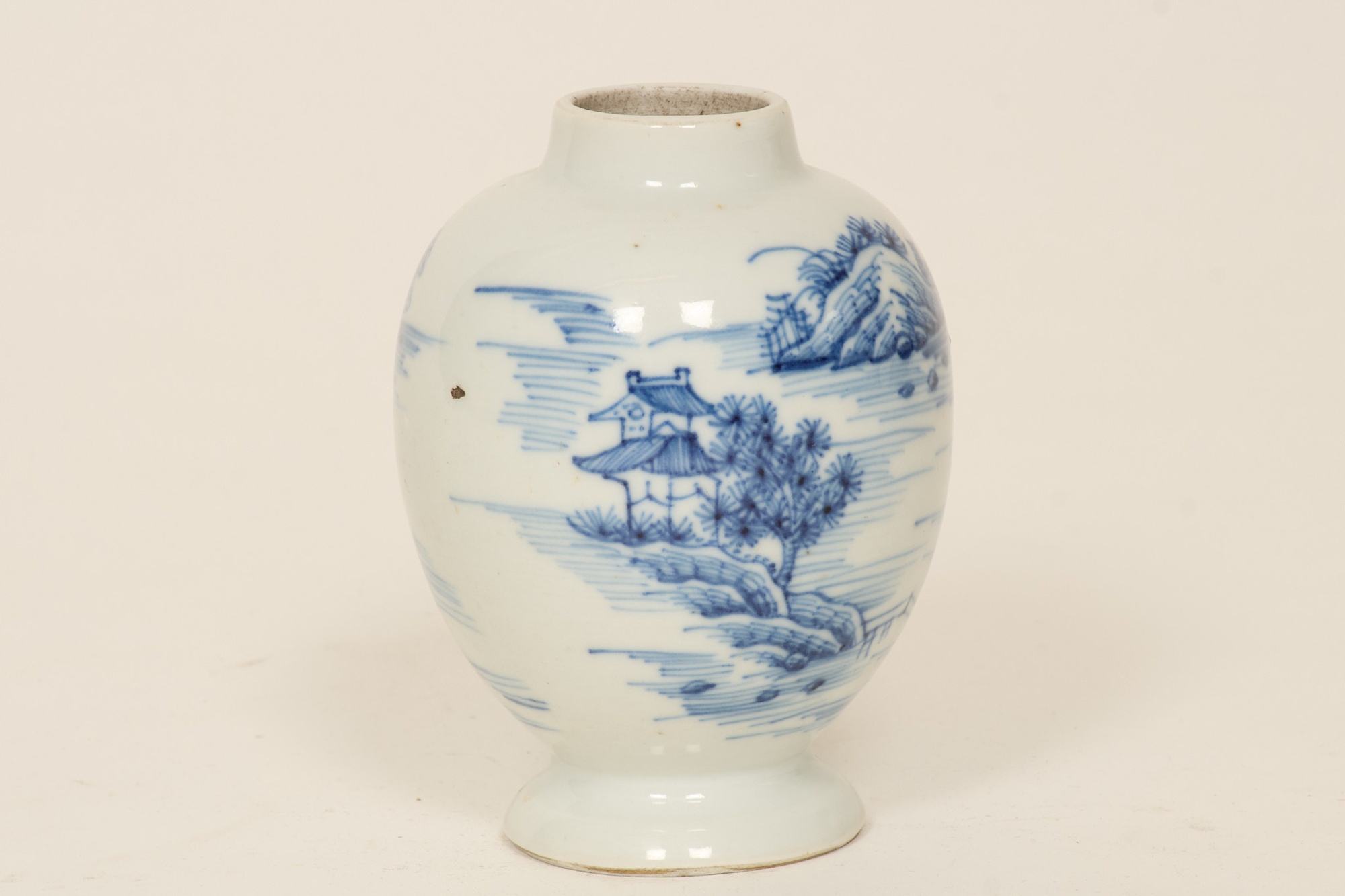 Dekor i underglasyrblått, med flodlandskap och figurscen, höjd 10 cm, smärre bruksslitage, saknar lock.