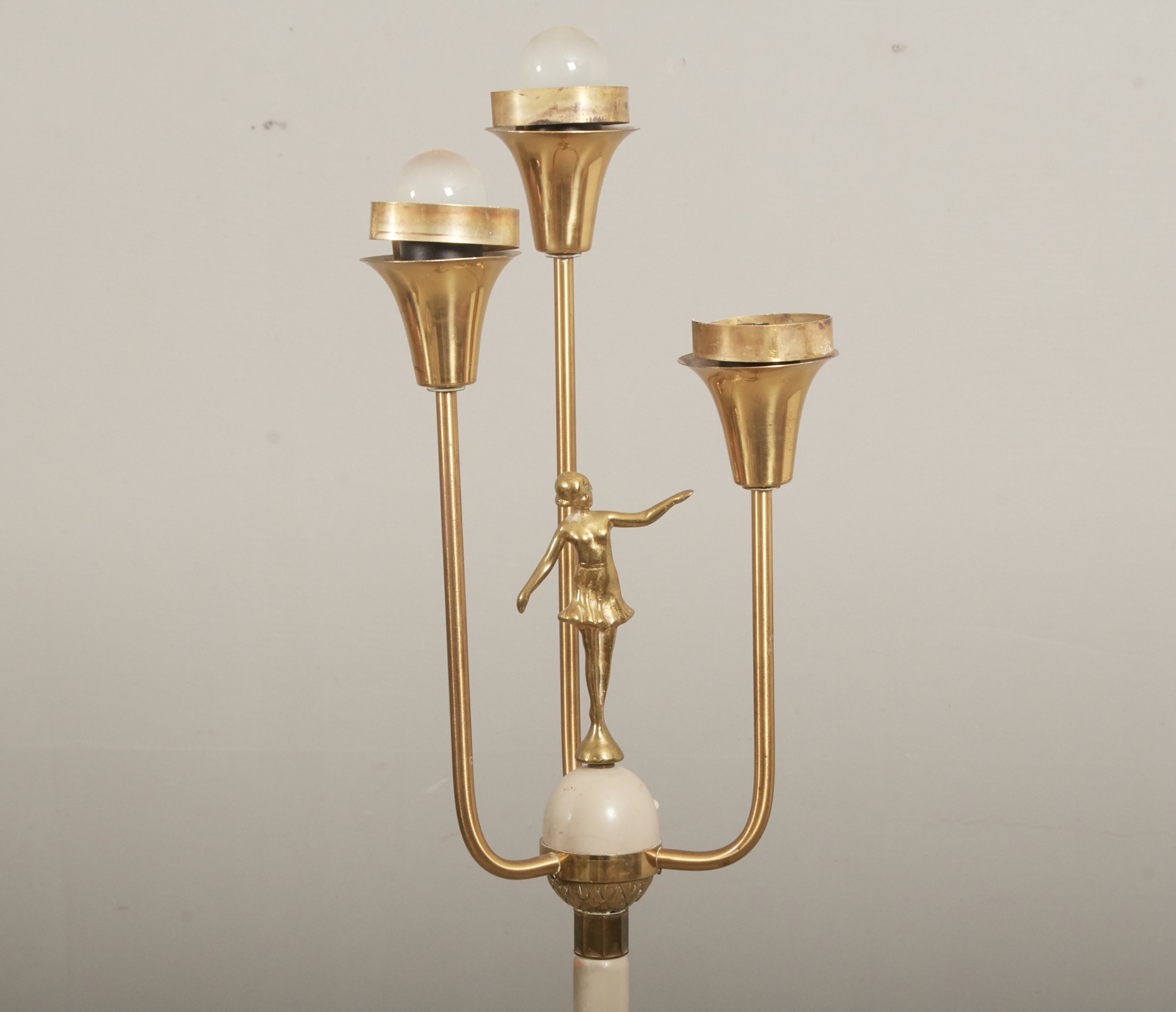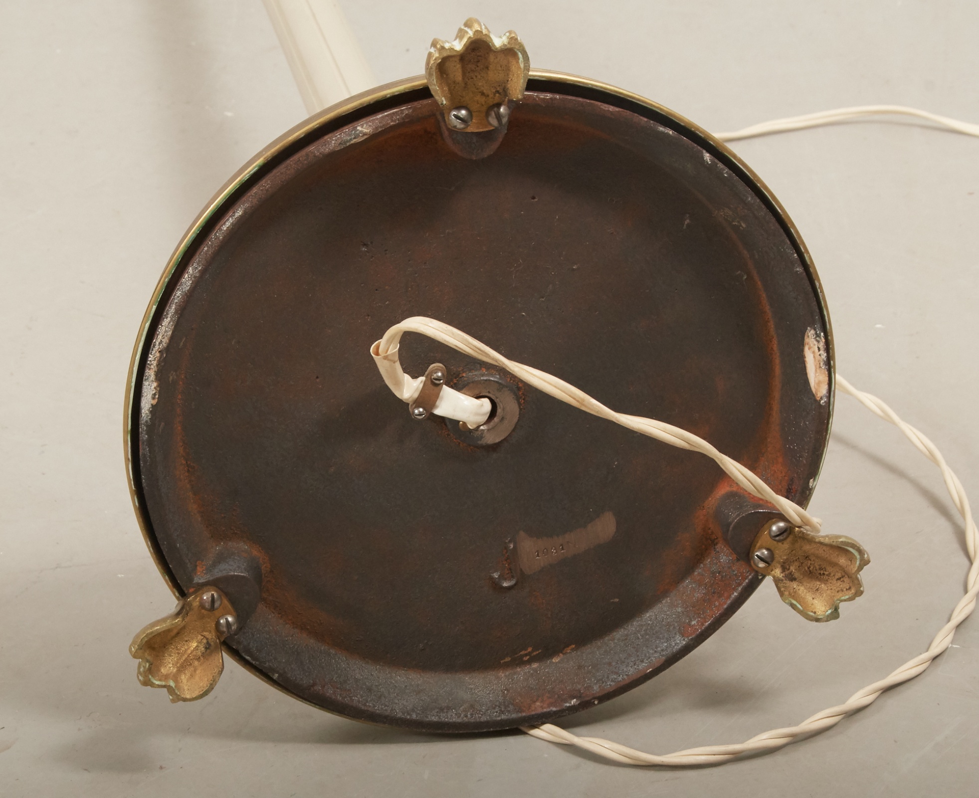1940-tal, 3 elektriska ljuspunkter, höjd till lampfäste ca 150 cm, åldersrelaterat bruksslitage, lampfäste defekta, ojordad elkontakt, saknar skärmar.
