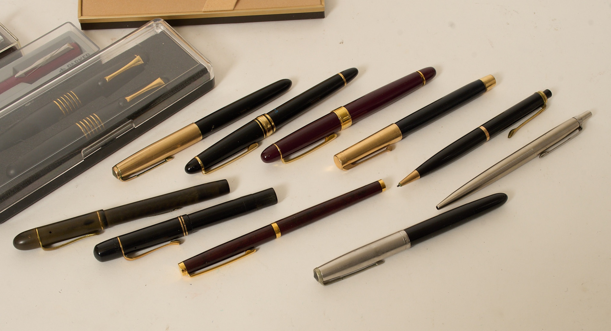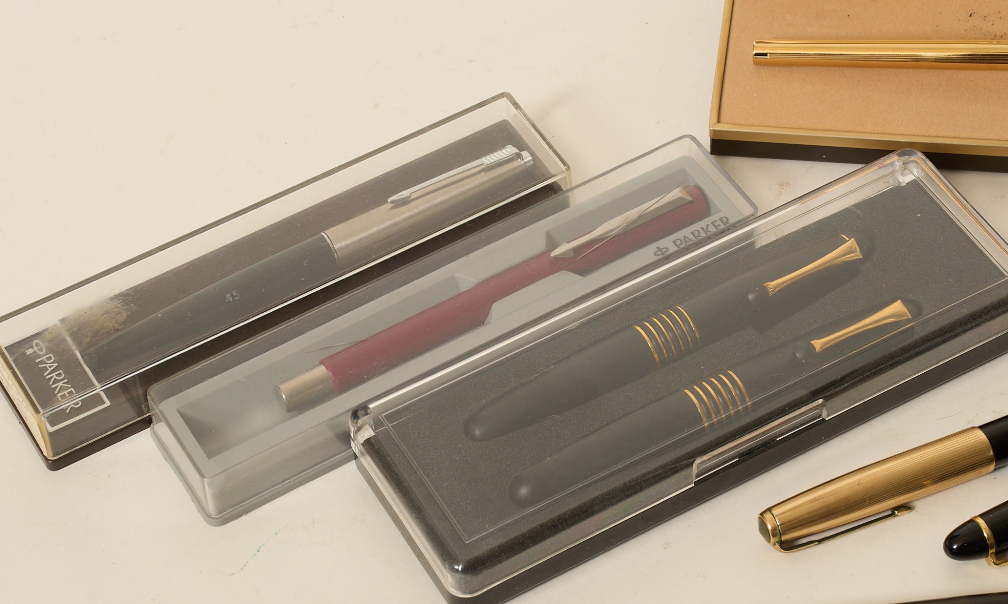 15 st, reservoar, bl.a. Parker 45, 51 Sheaffer, Waterman, Pelikan, Ballograf ballpen, Eversharp, Parker blyerts, Pelikan Gunther Wagner m.m.