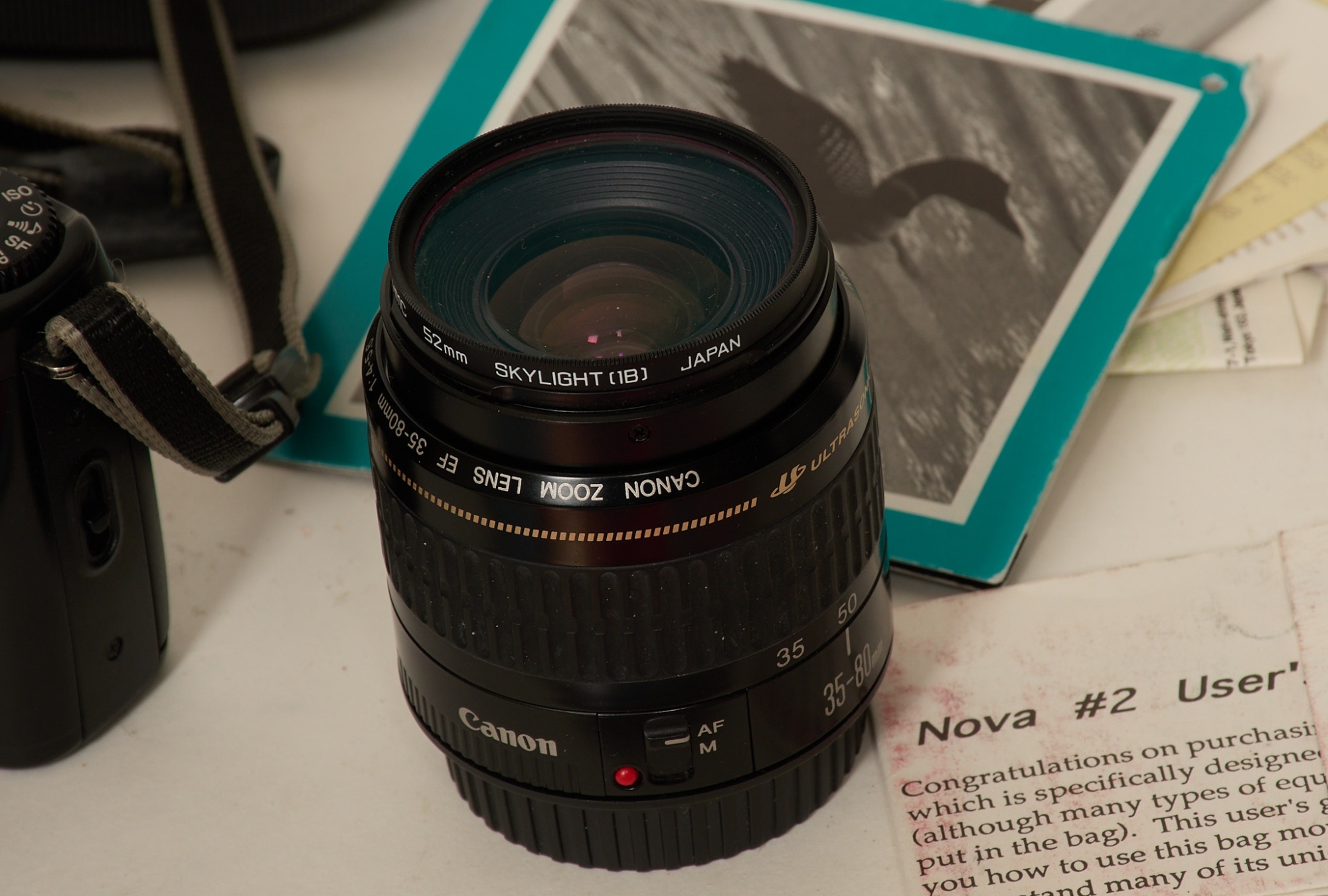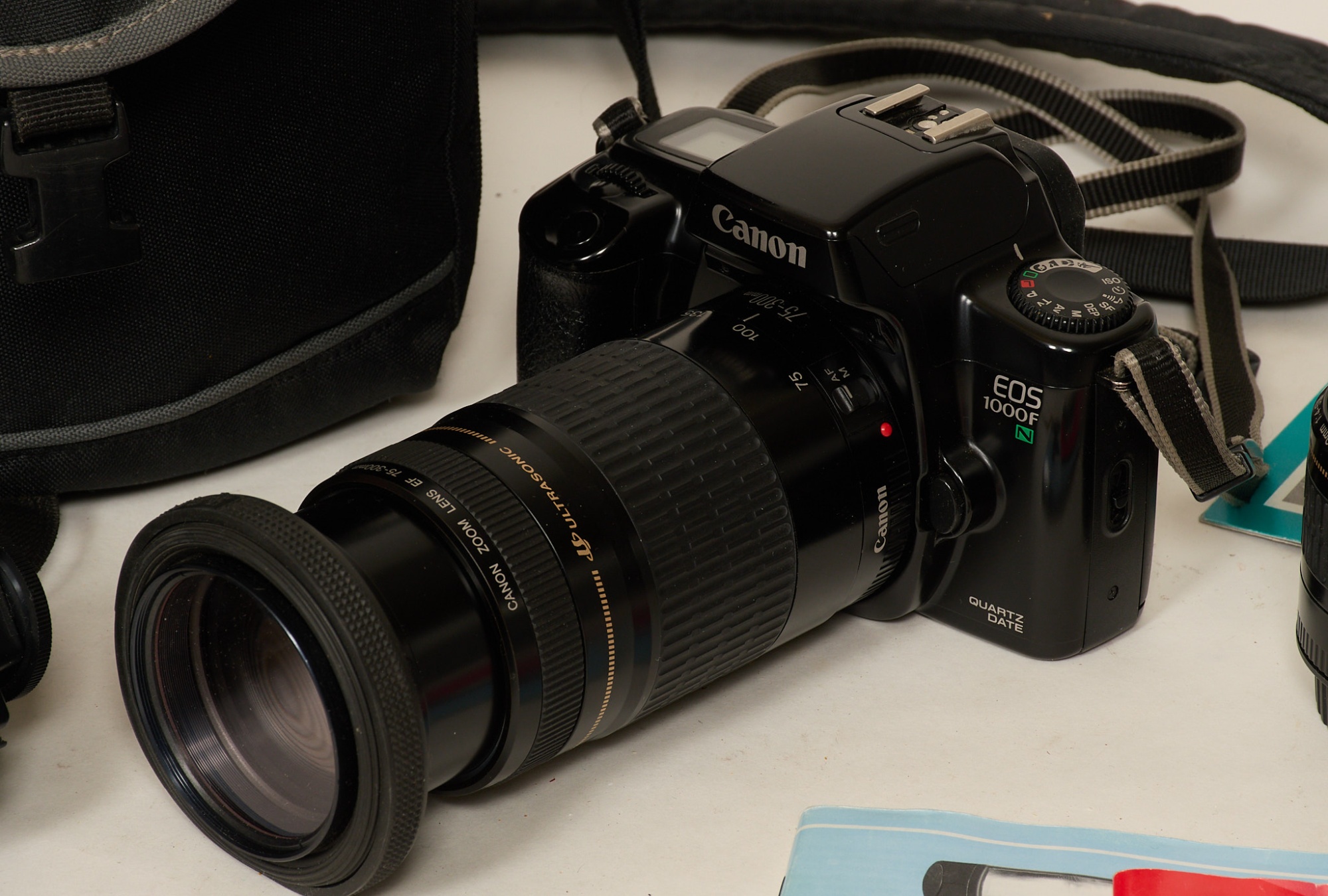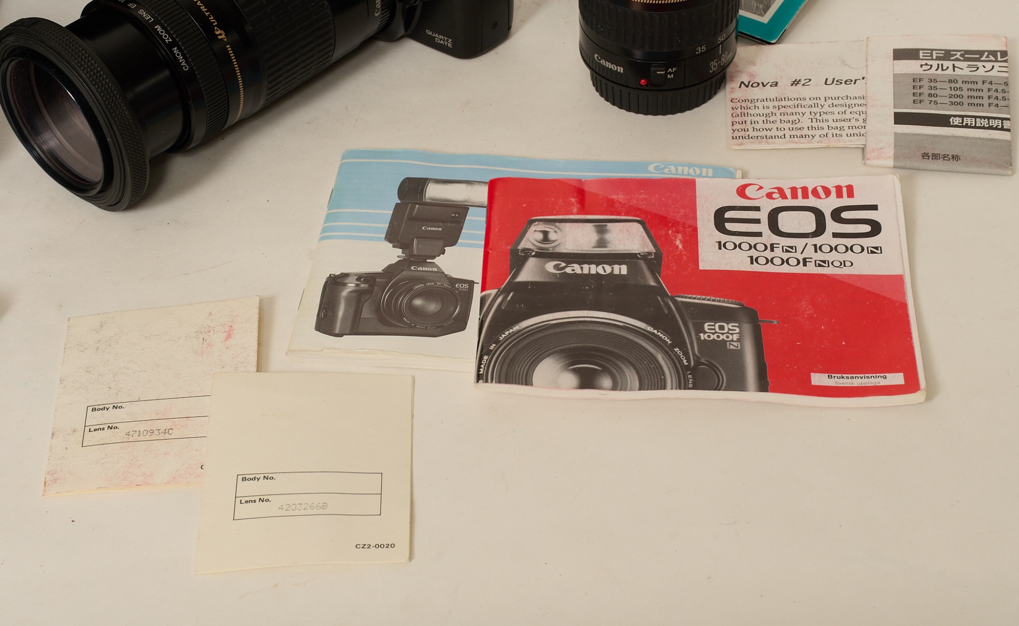 Canon EOS 1000 F, objektiv Canon zoom 75-300 mm, objektiv Canon 35-80 mm, Canon blixt 430 EZ, instruktionsbok medföljer.