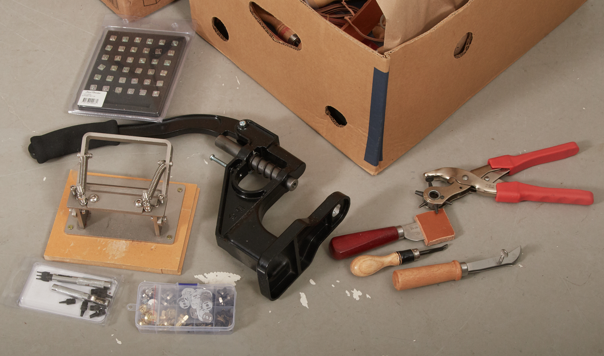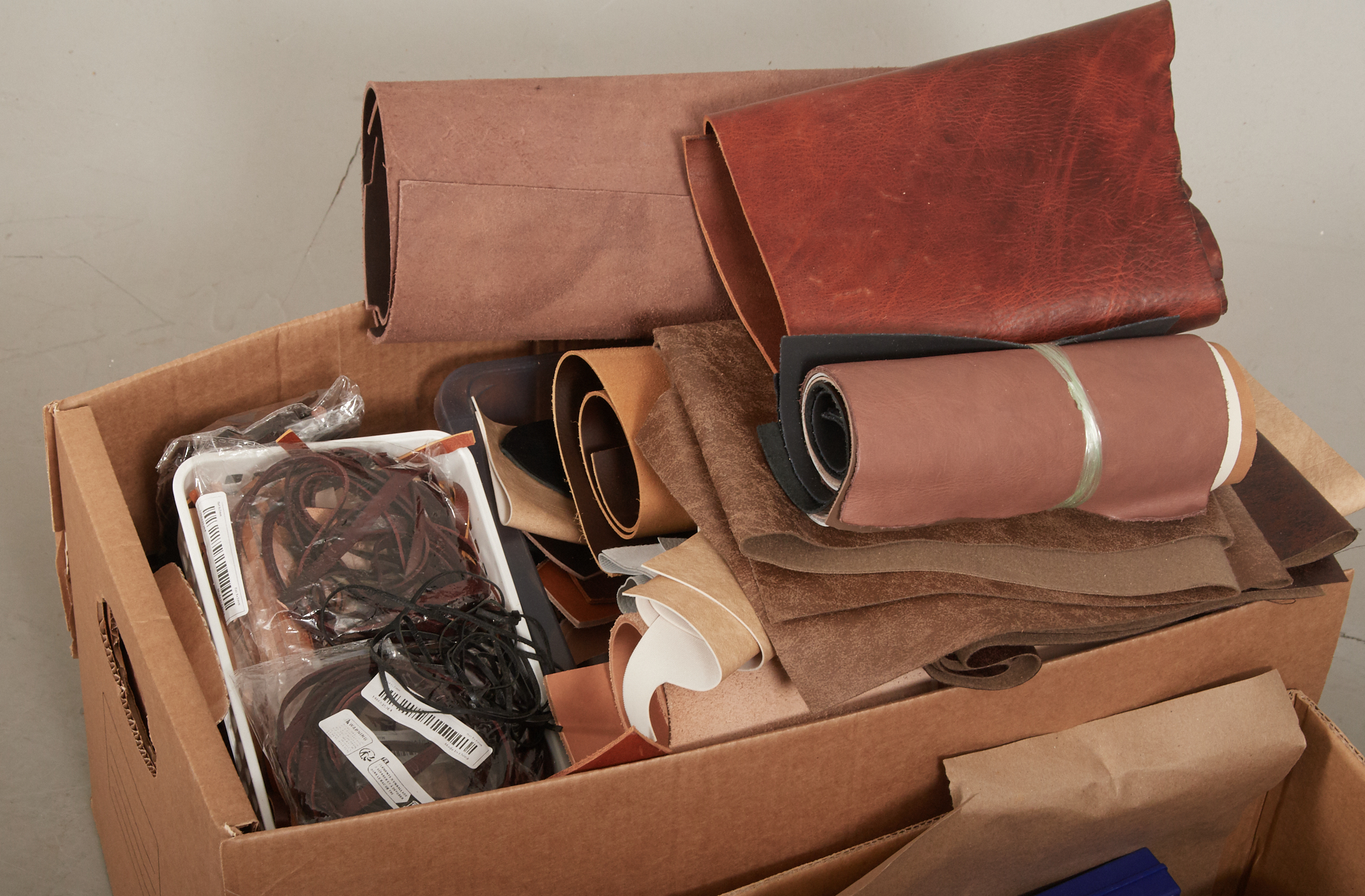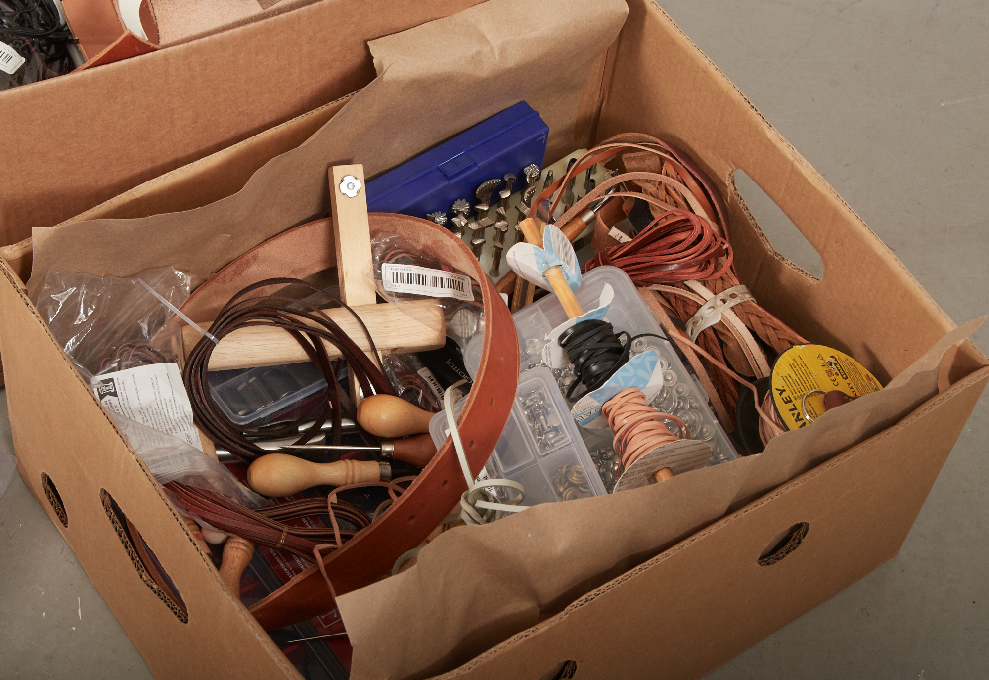2 kartonger med stuvbitar av läder, lädersnören, verktyg, hålslag m.m.