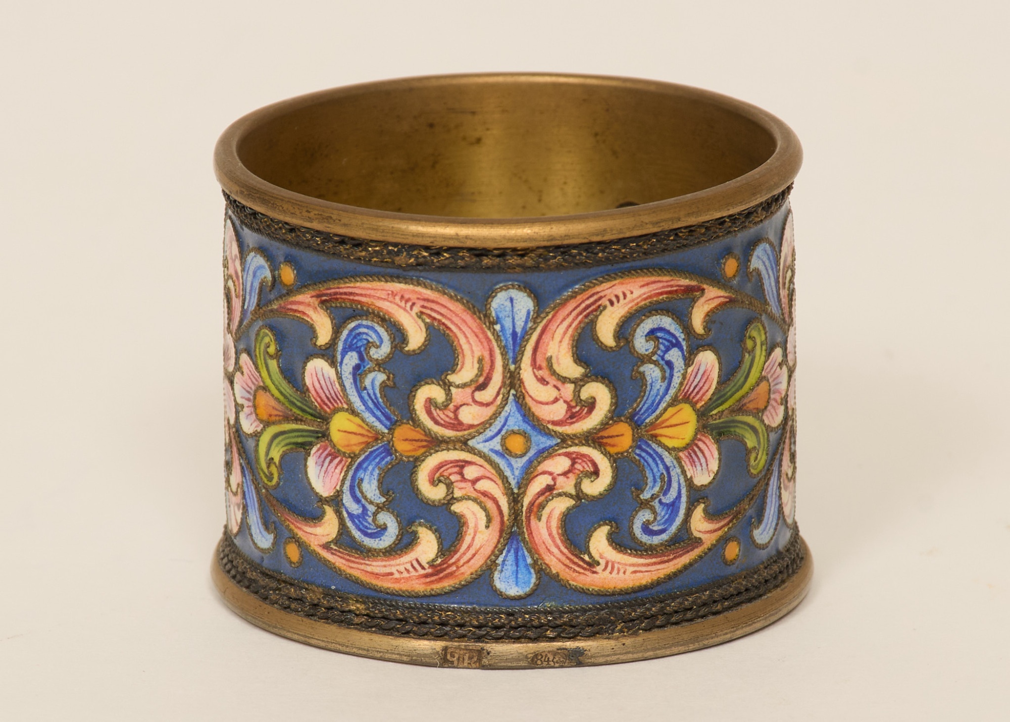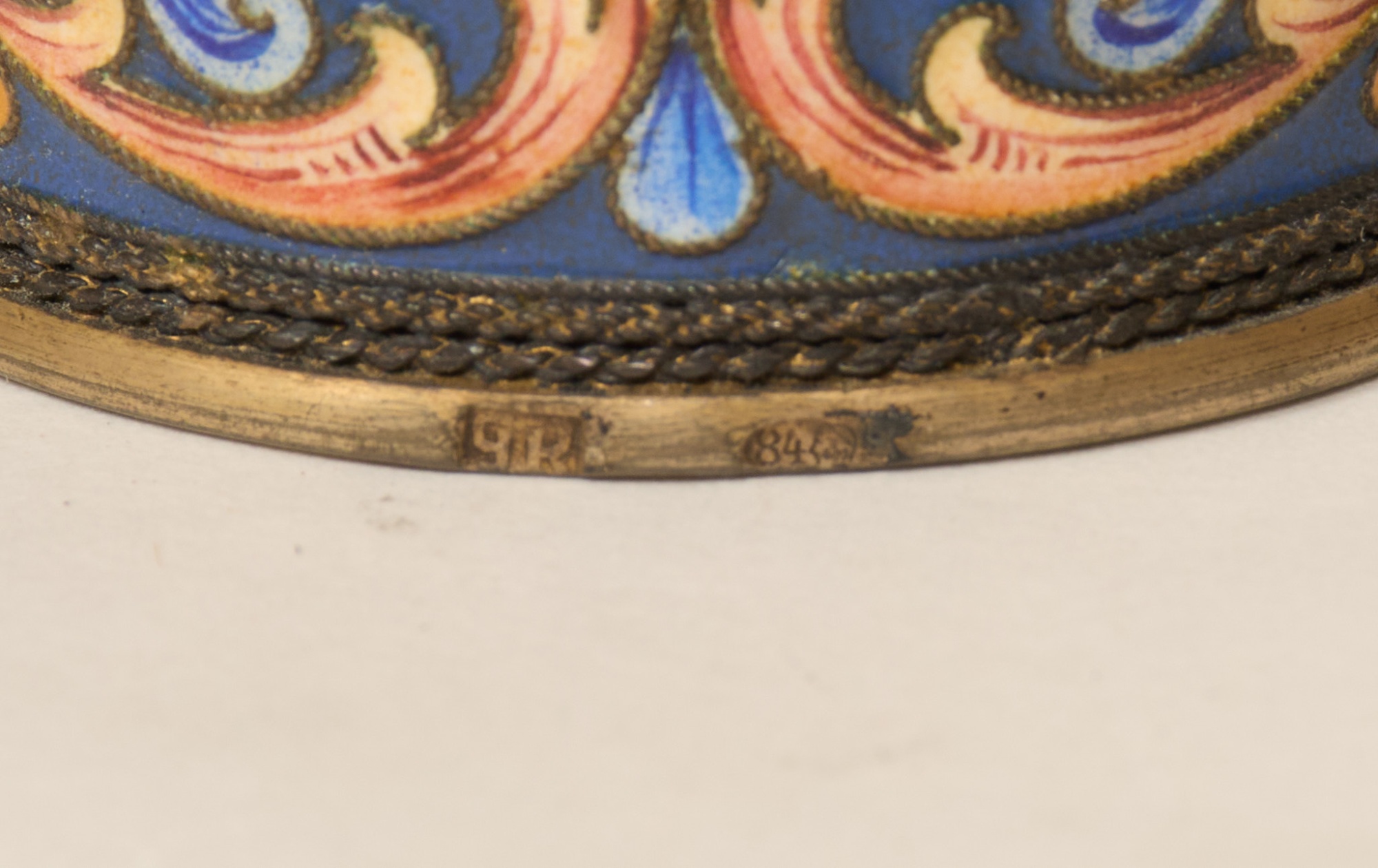 1900-talets början, förgyllt silver, samt emaljarbete, diam 4,5 cm, höjd 4 cm, tot.vikt 42,6 gram, bruksslitage.
