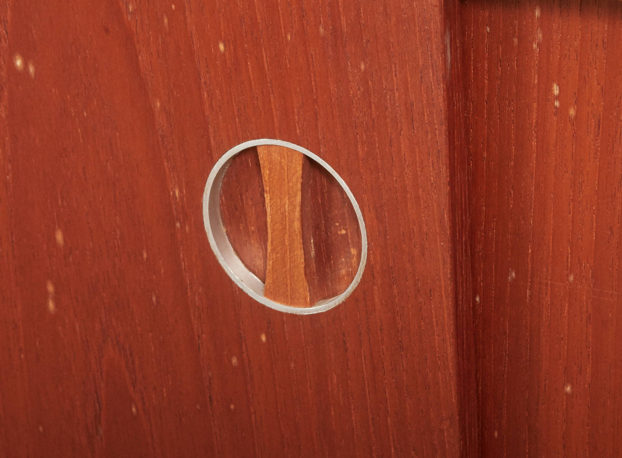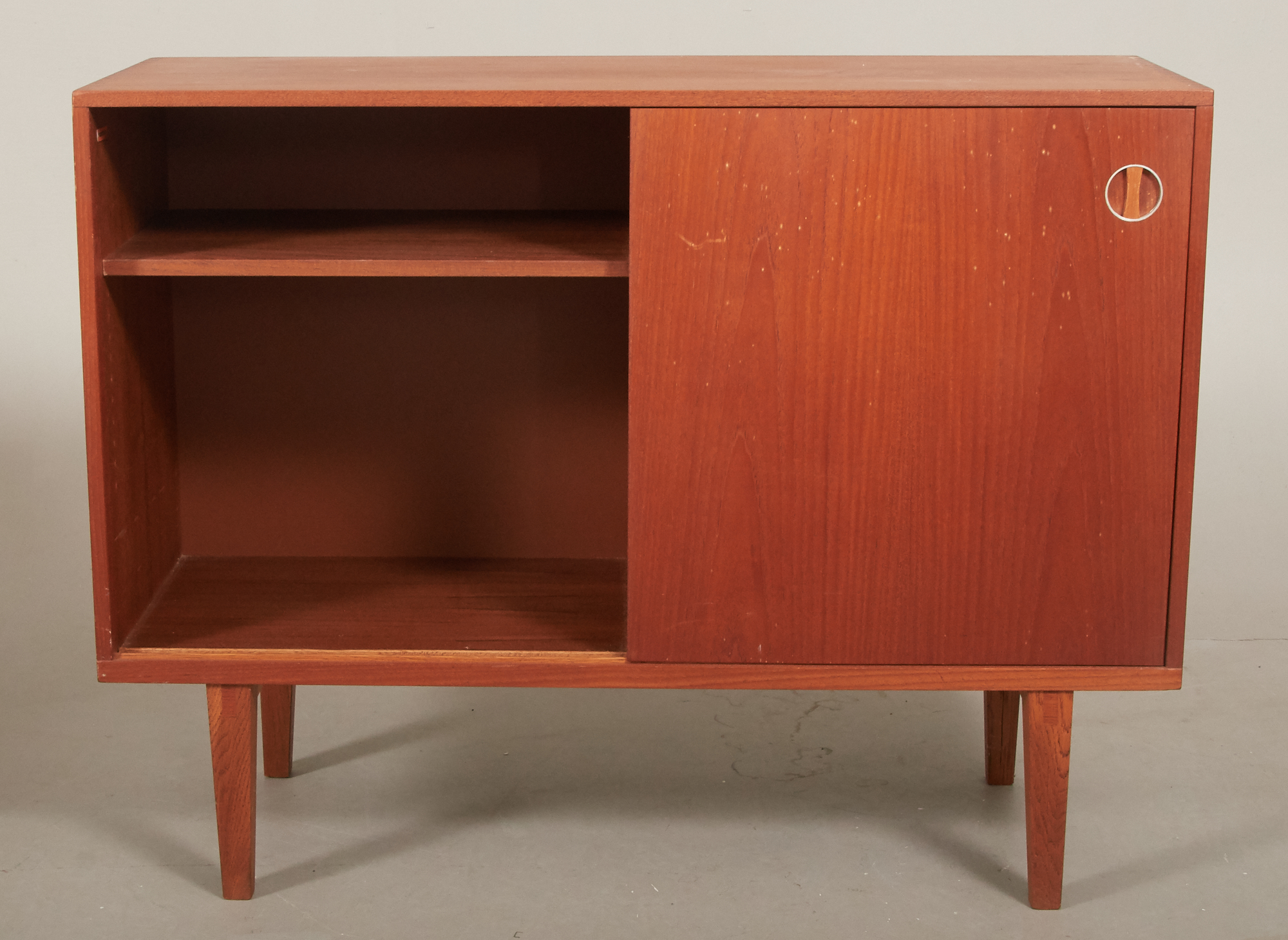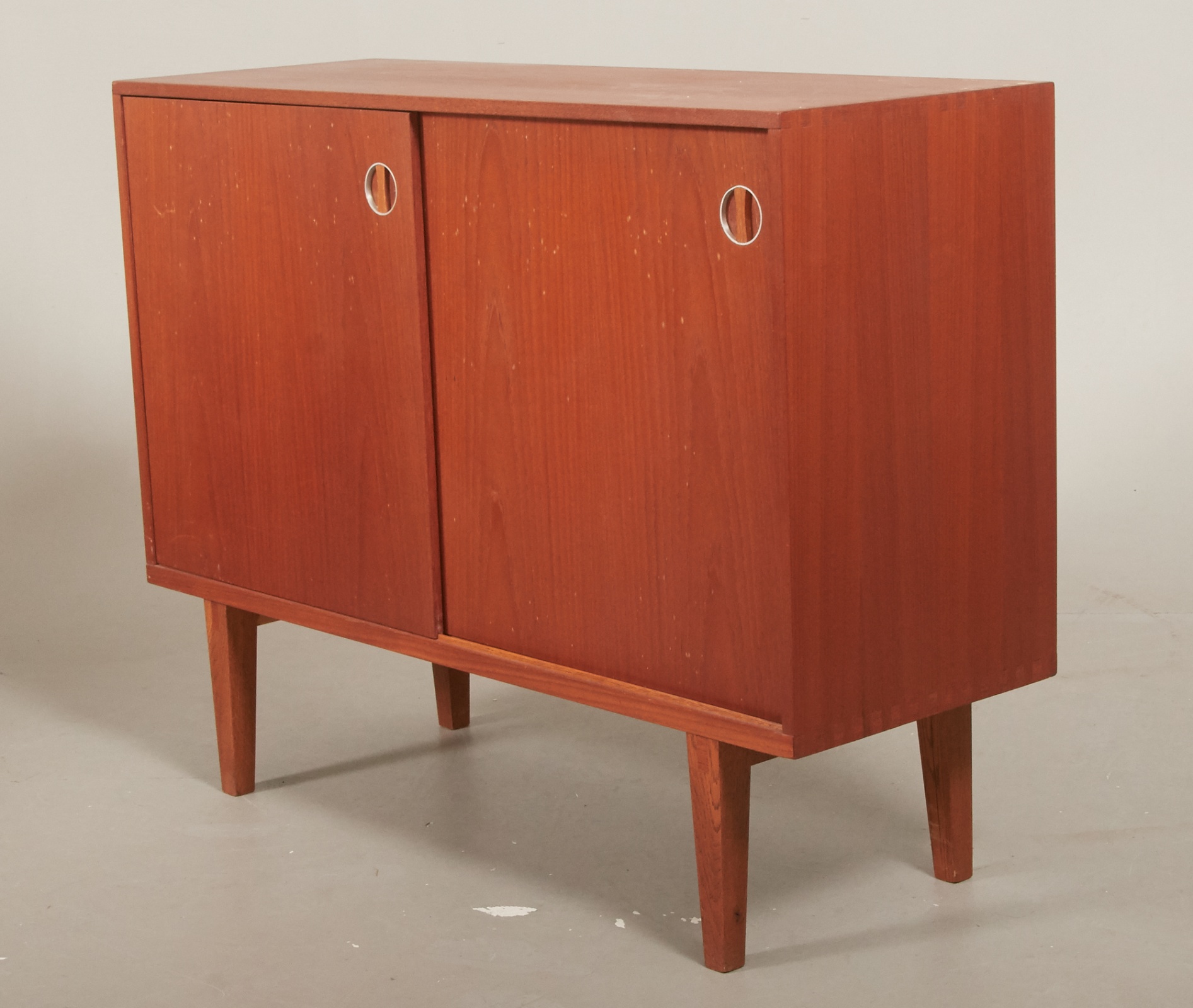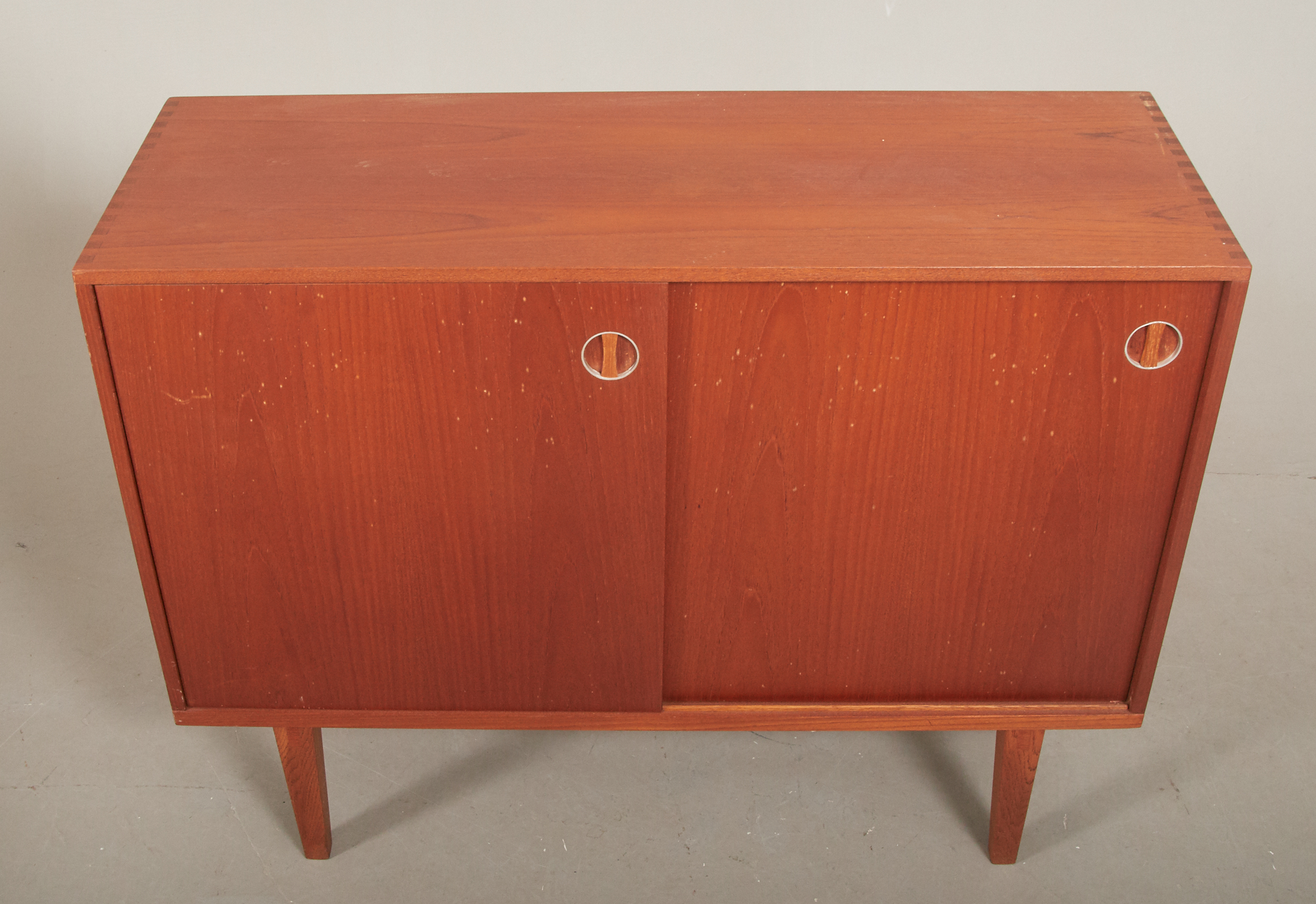 Teak, skjutdörrar med bakomliggande förvaring, 100 x 35 cm, höjd 77 cm, bruksslitage.
