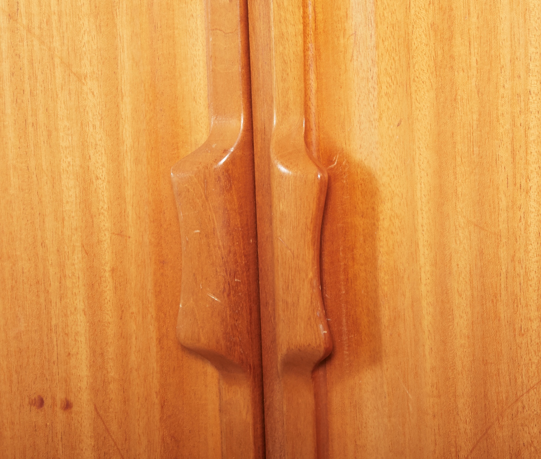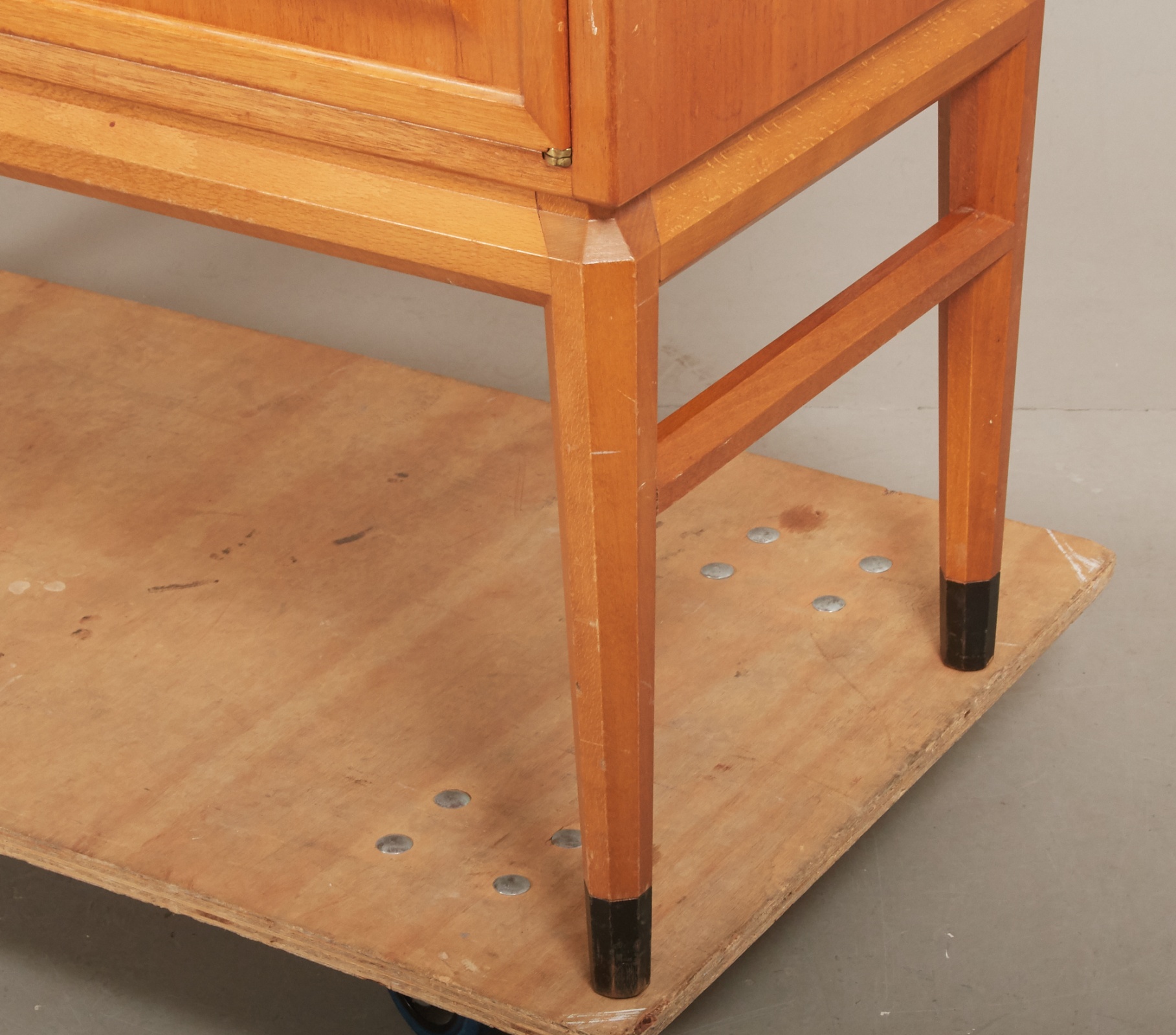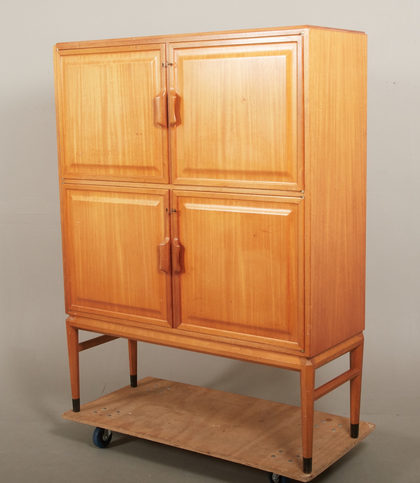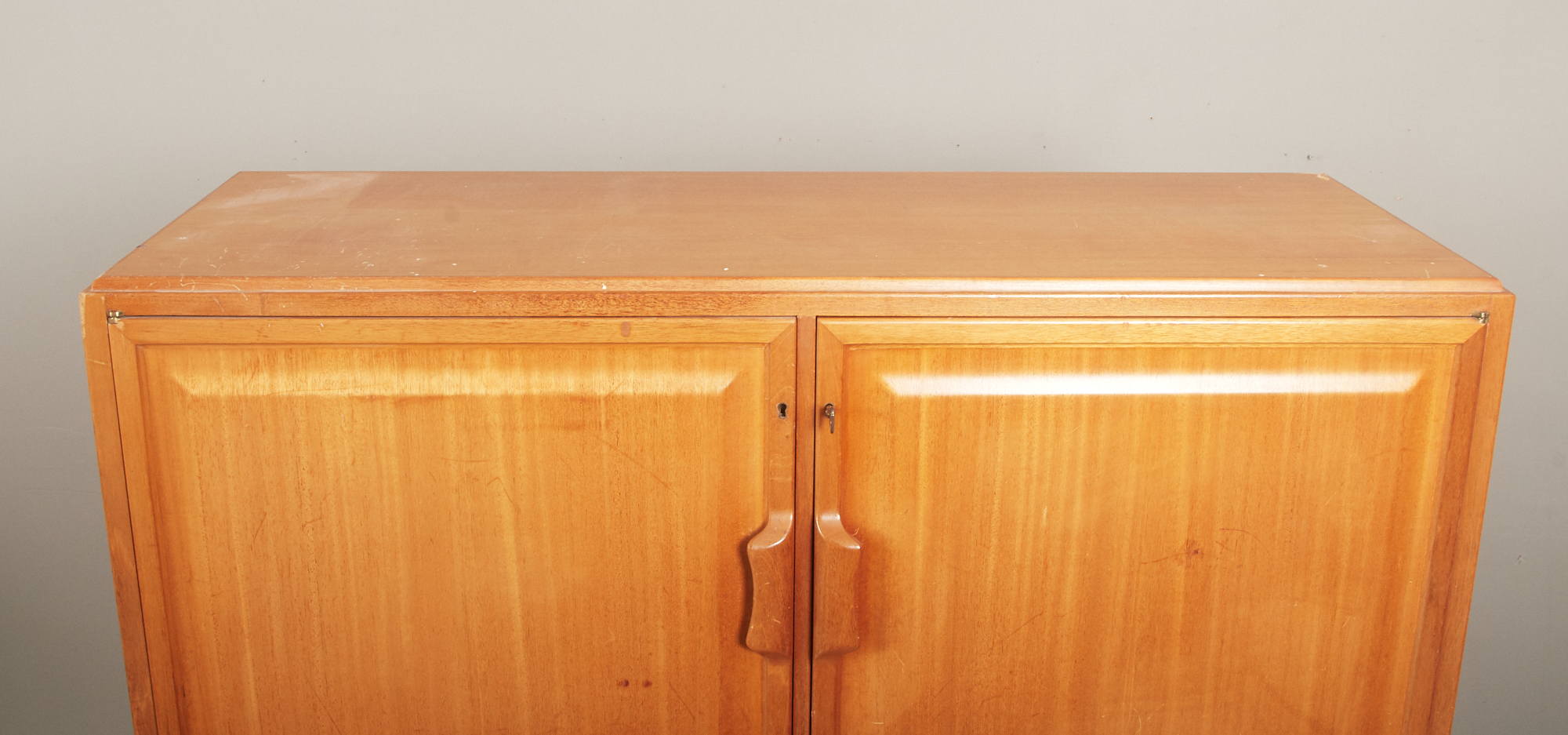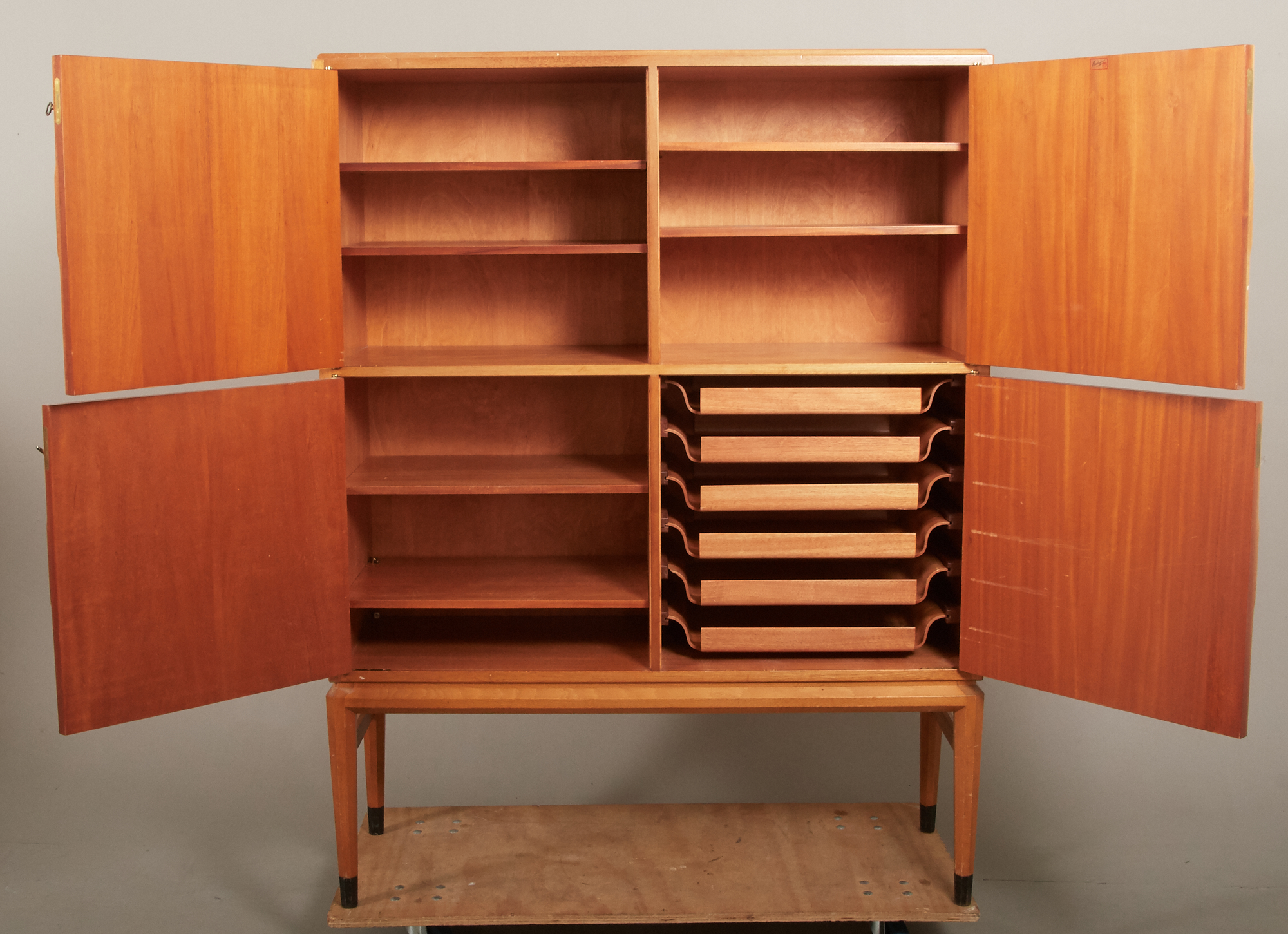 Mahogny, 4 dörrar, bakomvarande hyll- samt lådförvaring. 118 x 43 cm, höjd 156 cm. Nycklar finns. Brukslitage, repor och märken