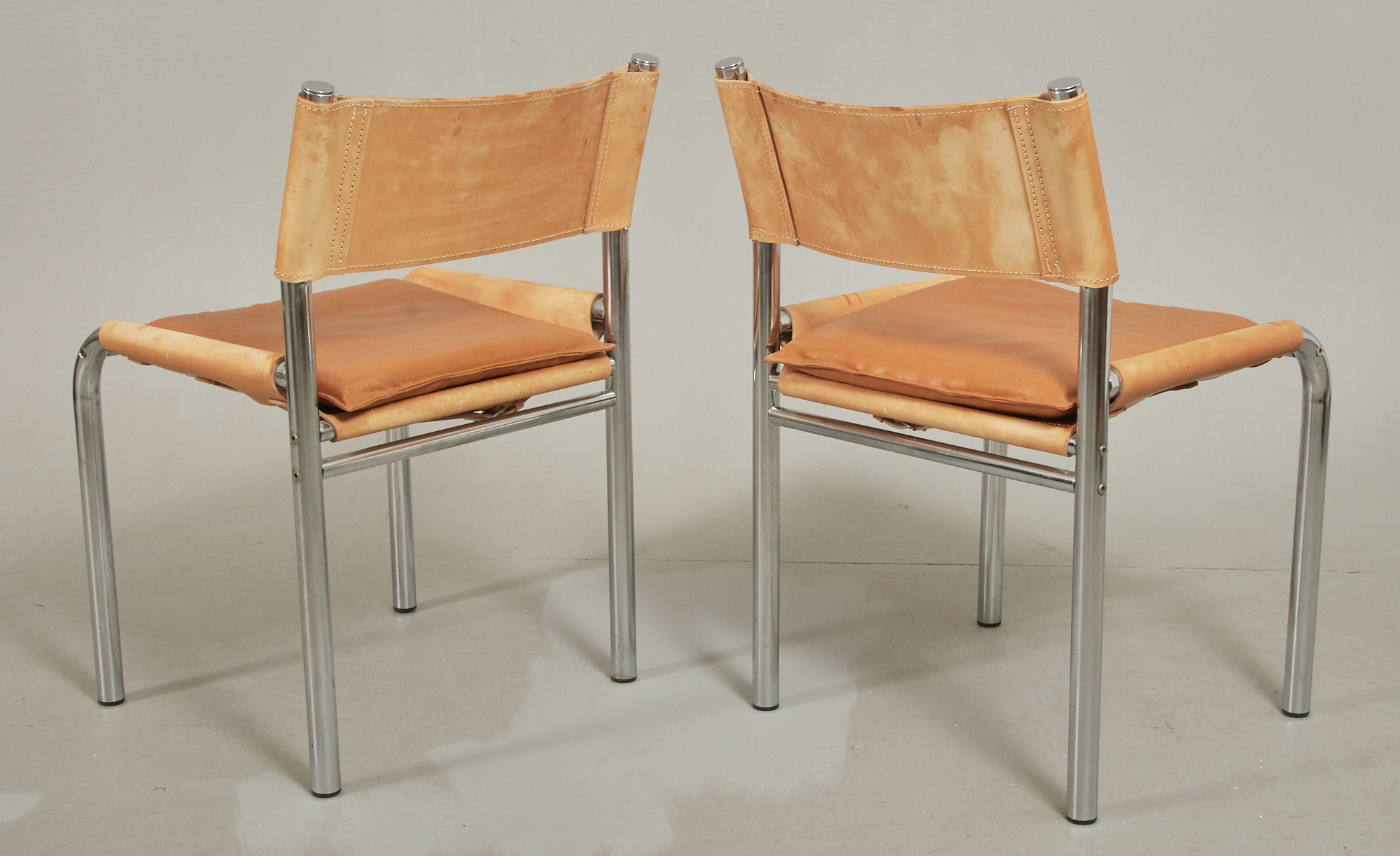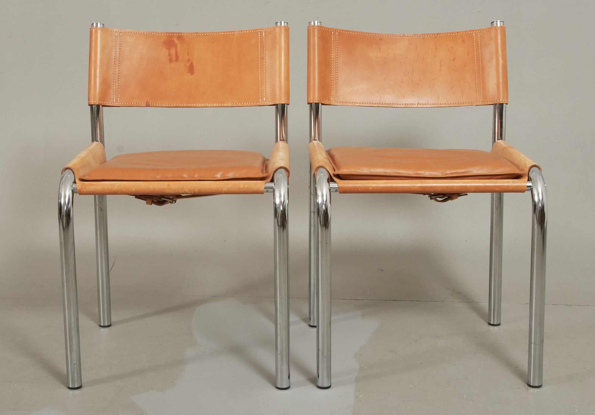 2 st, stomme i kromad metall, klädsel samt dyna i läder, smärre bruksslitage, men läder med mindre fläckar.