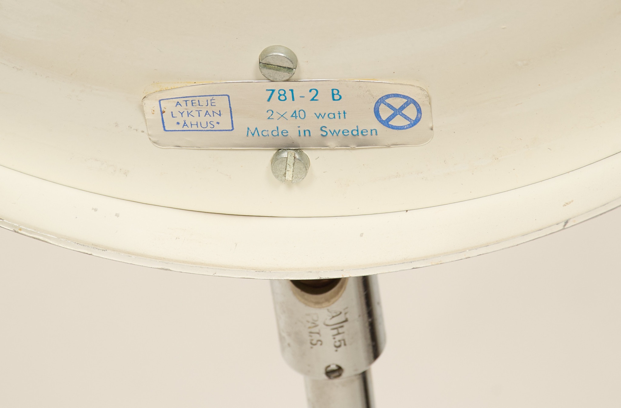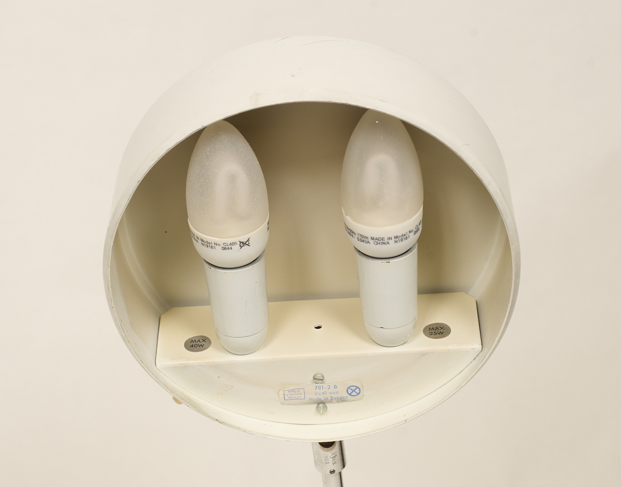 Fot i kromad metall, samt läder, skärm i vitlackerad plåt, höj- samt sänkbar. Bruksslitage, saknar raster, repor.