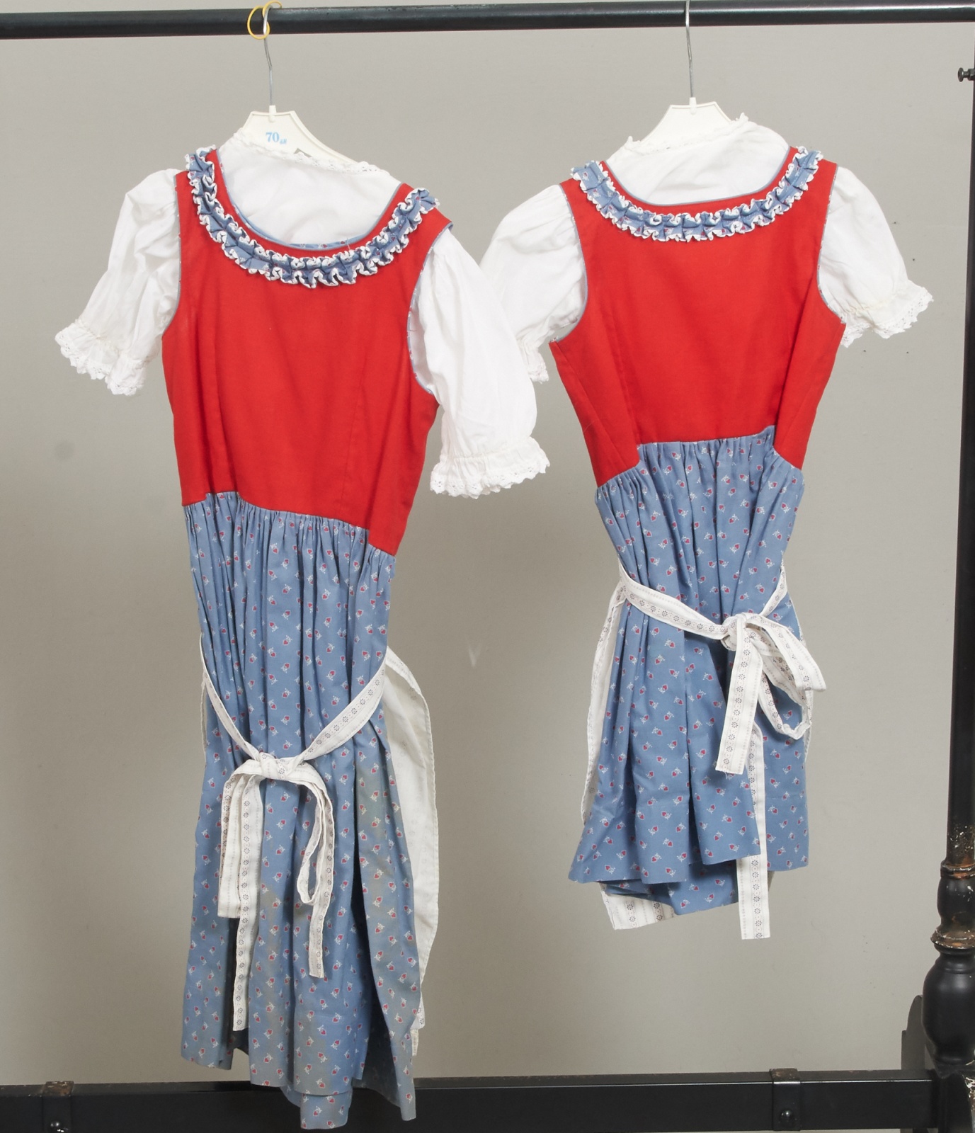 2 st á 3 delar, blus, klänning, förkläde. Uppskattad storlek 7-8 år samt 5 år. Fläckar förekommer.
