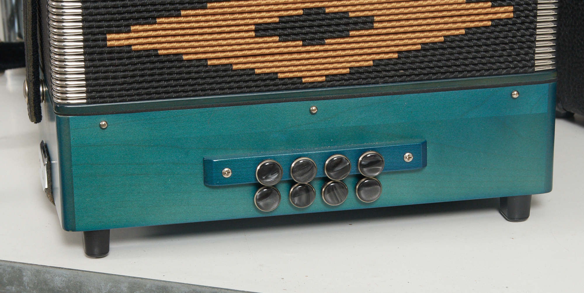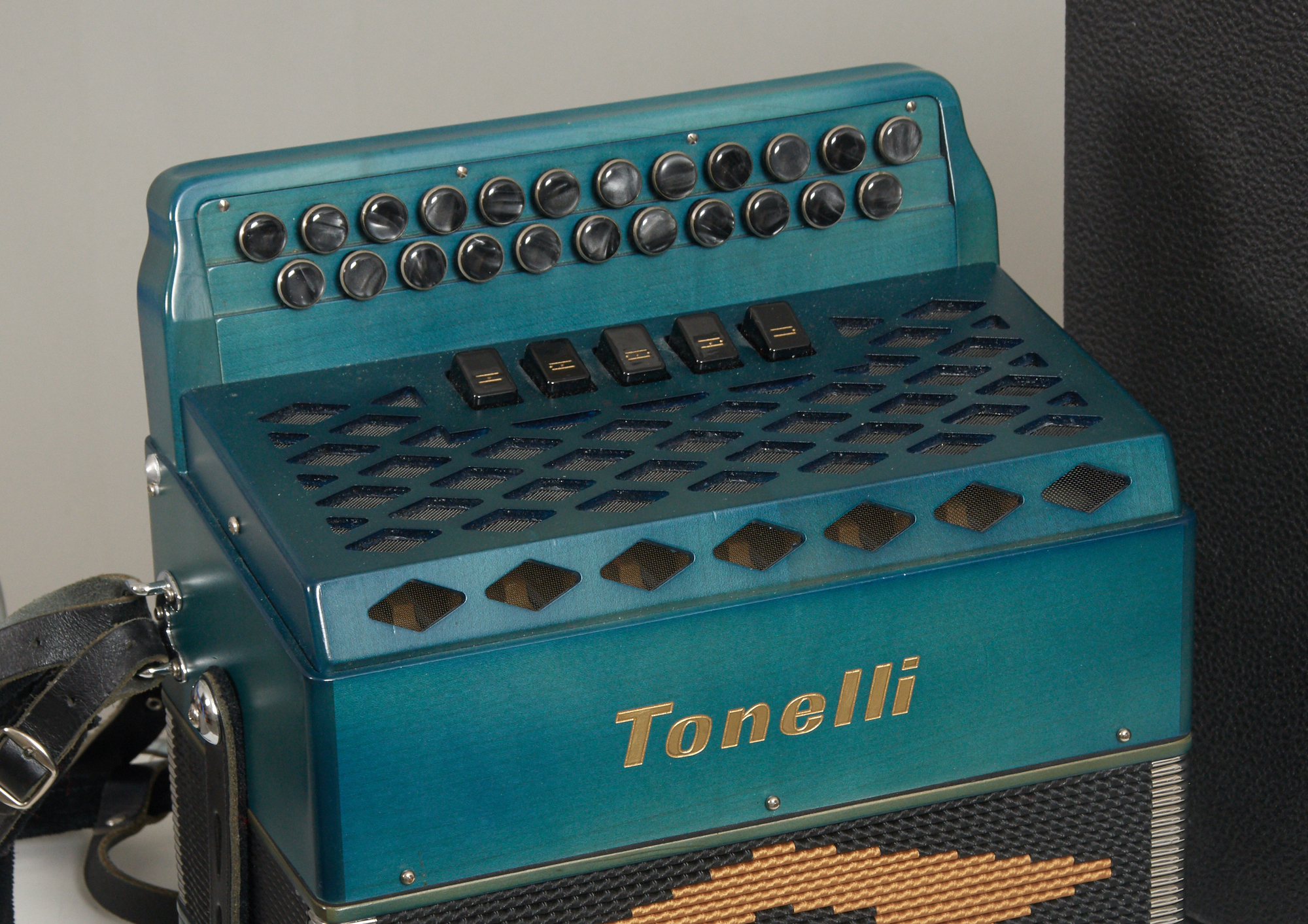 Tvåradigt knappdragspel, förvaringsväska, smärre yttre bruksslitage. Ej genomgånget eller funktionstestat.