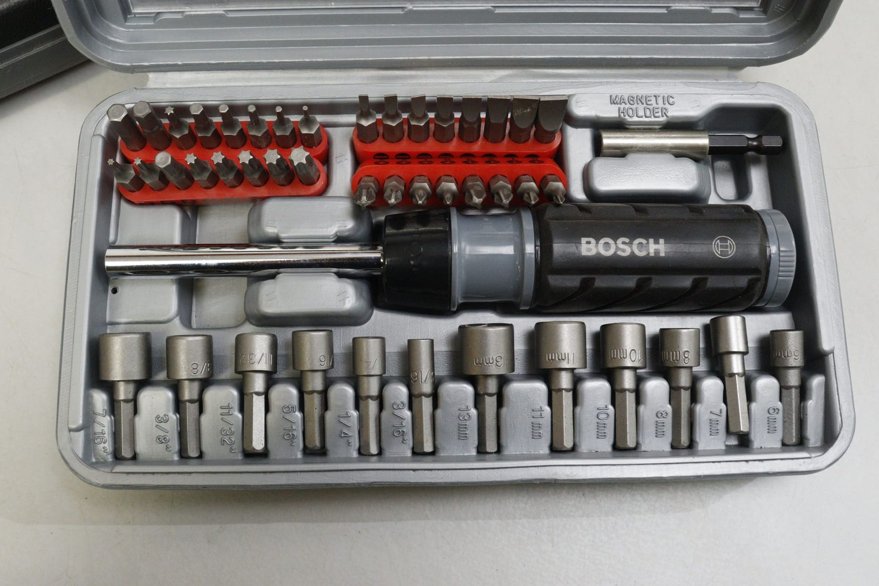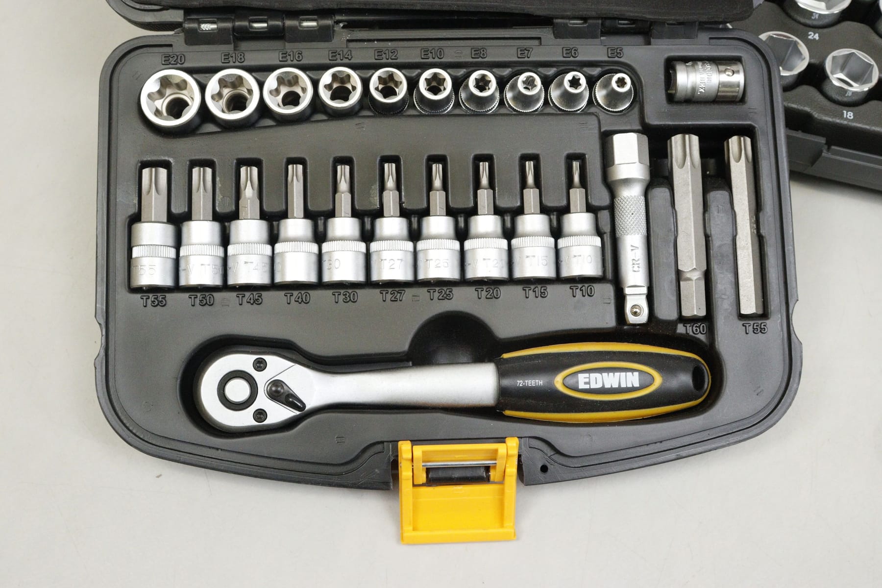 Hylsnyckelsatser, sortimentslådor, batteriladare och dunk
