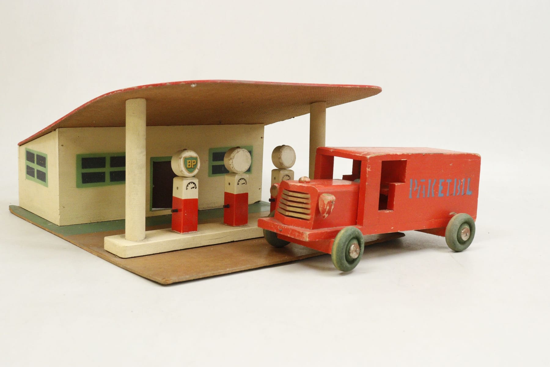Leksaksgarage, BP, och paketbil, trä