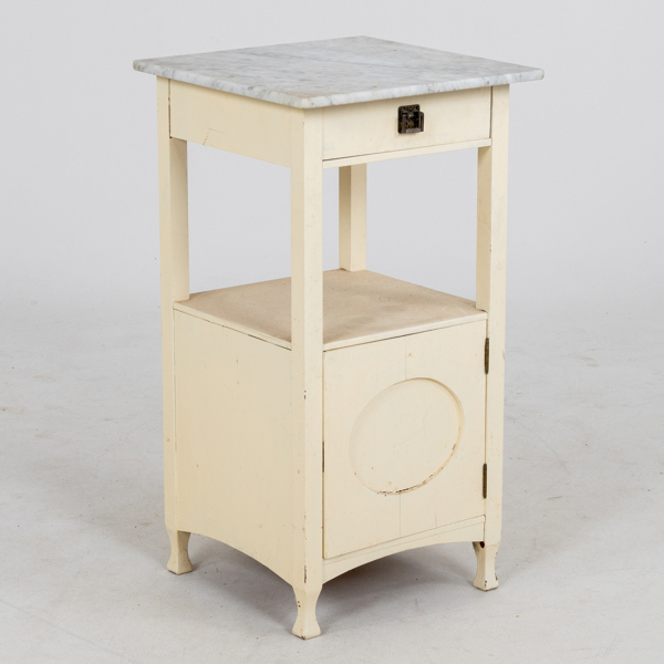 Målad, låda i sarg, hyllplan samt skåp, skiva av marmor, höjd 74, 40 x 40 cm