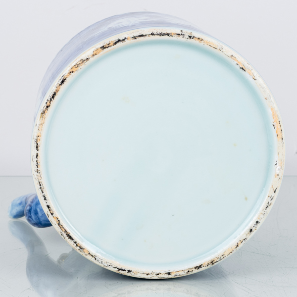 Blå dekor av figurscener, hänkel av mässing, höjd inkl hänkel ca 28 cm