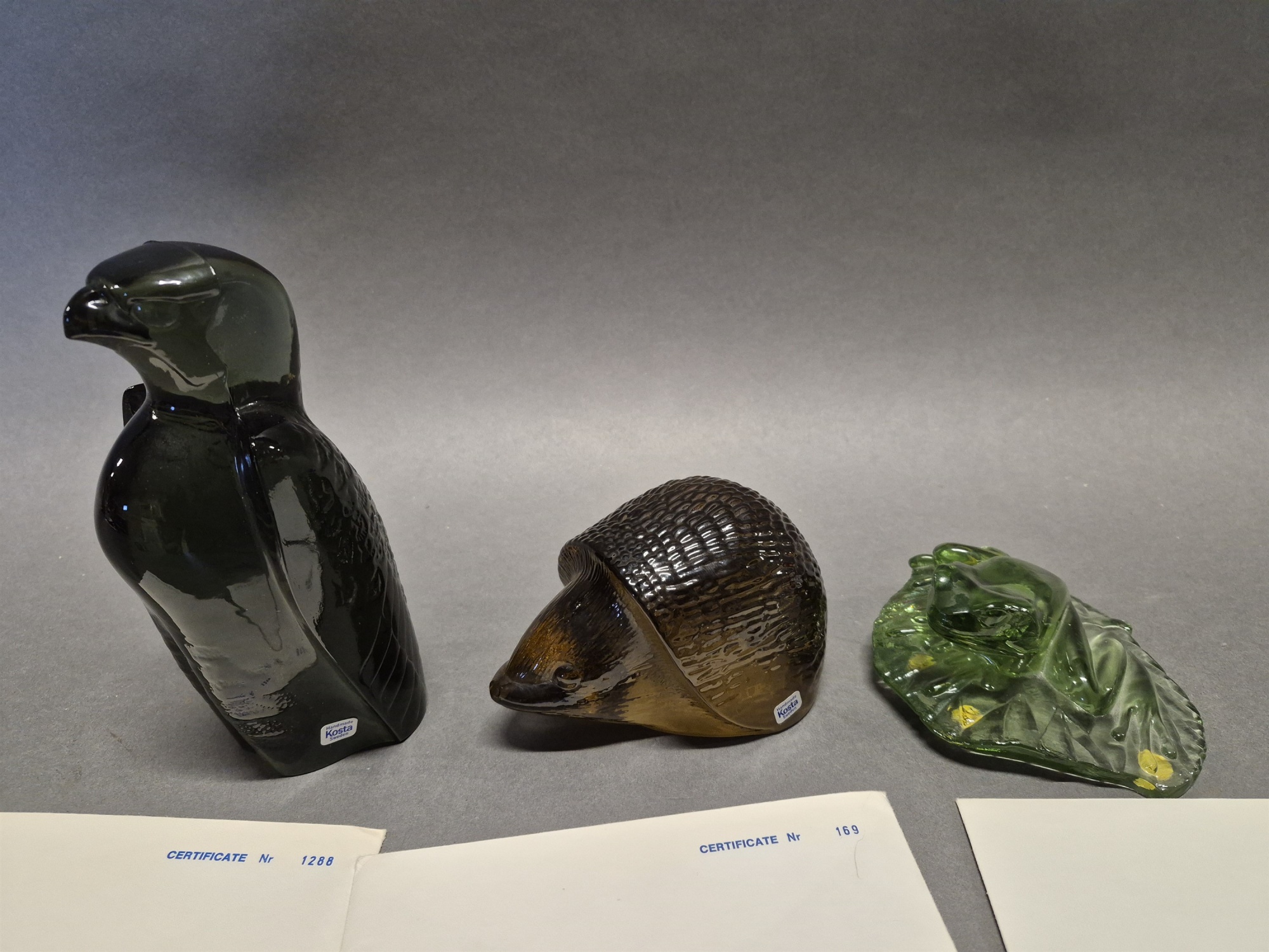 Konstglas 3 st P.Hoff Kosta, pilgrimsfalk, igelkott och lövgroda, limited edition för WWF, högsta höjd 17 cm