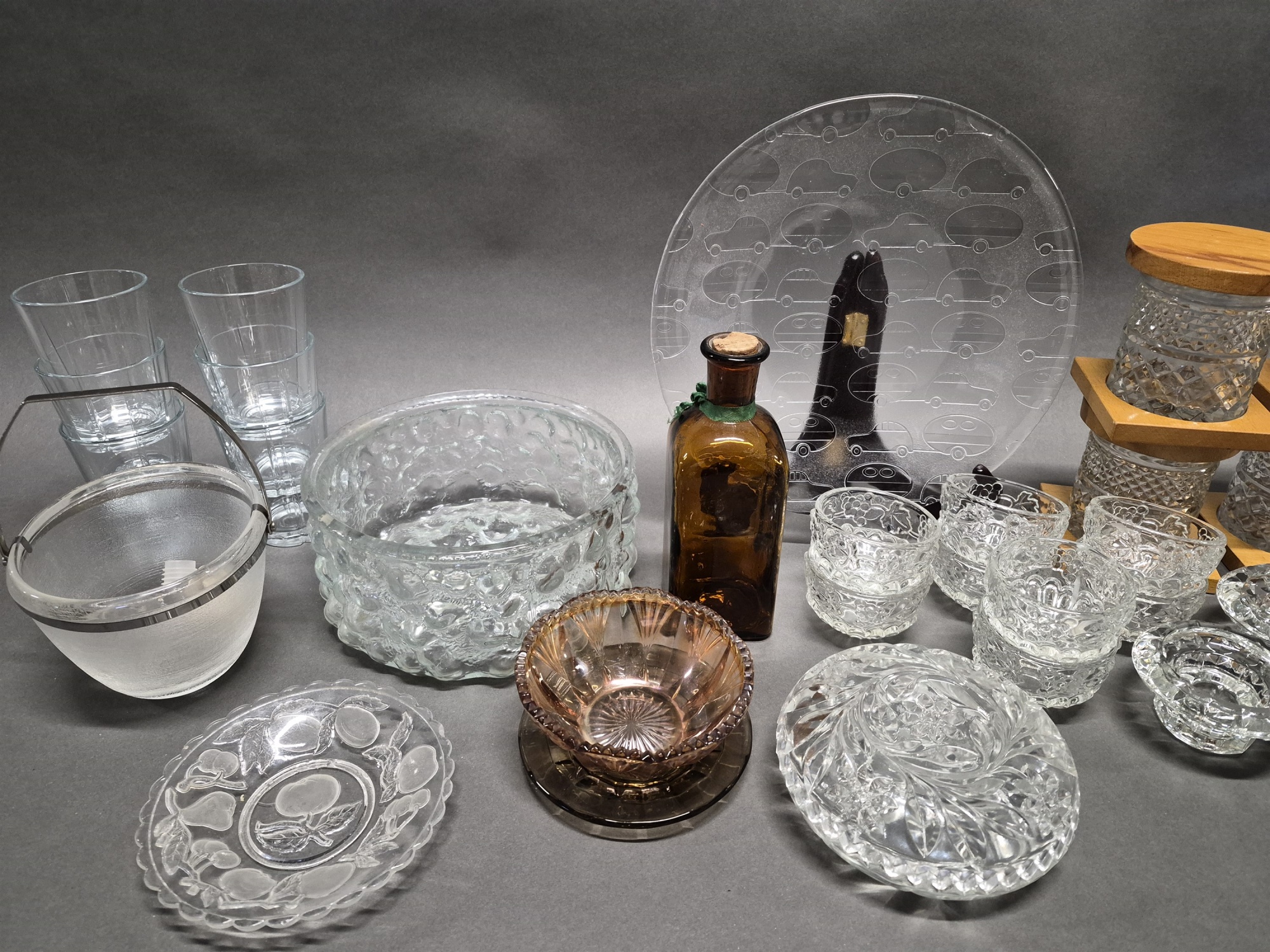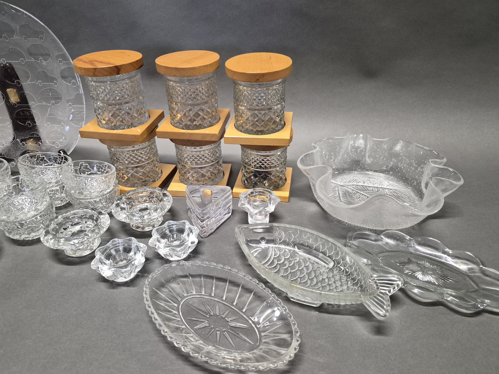 Bilder Parti glas bla ljushållare och skålar, största diameter 29 cm