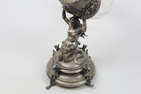 Bilder Dryckeshorn, 18/1900-tal, troligtvis Tyskland, försilvrad mässing och glas, höjd 40 cm