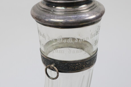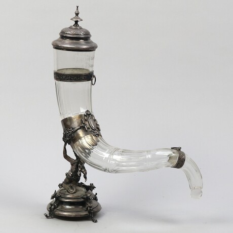 Dryckeshorn, 18/1900-tal, troligtvis Tyskland, försilvrad mässing och glas, höjd 40 cm
