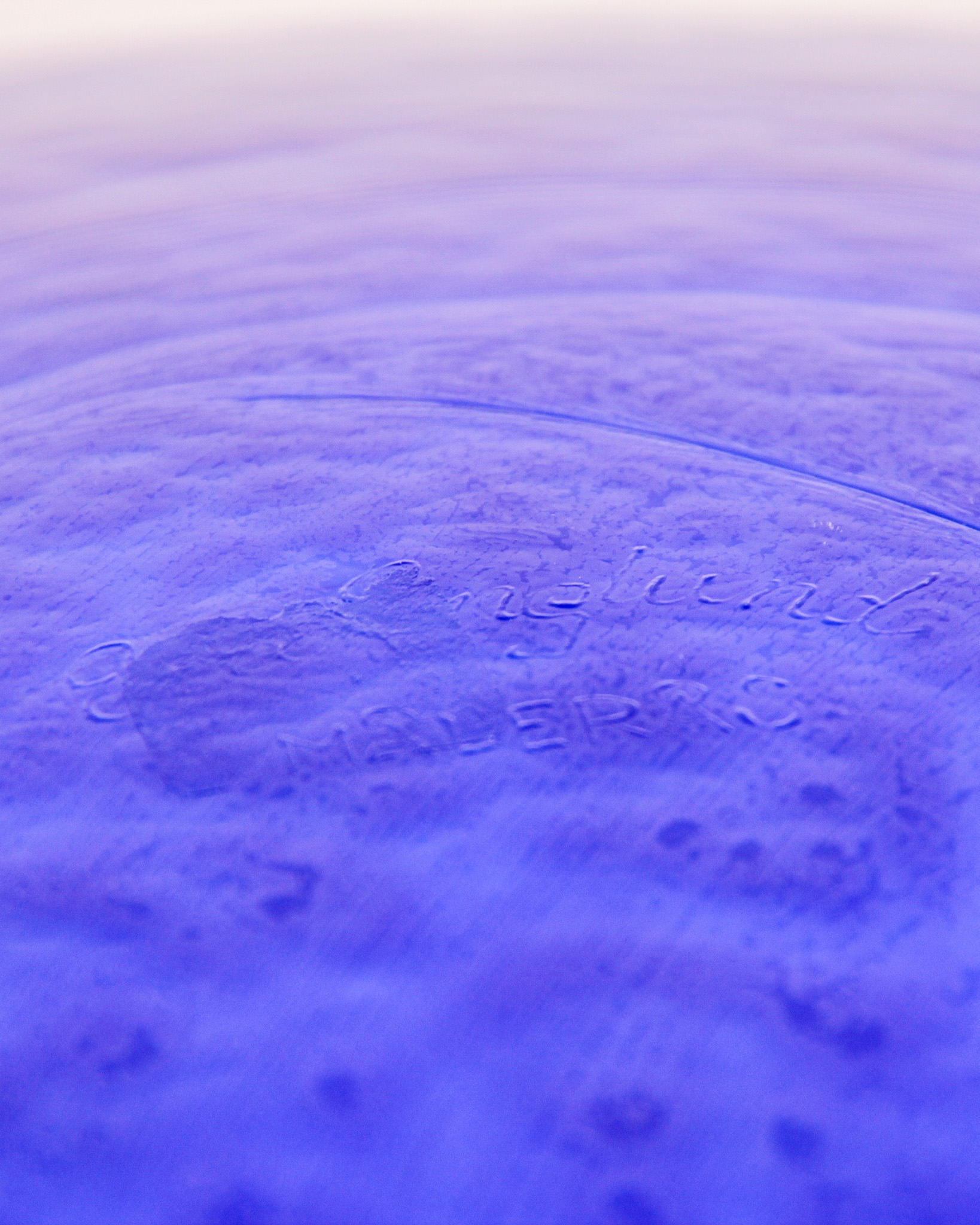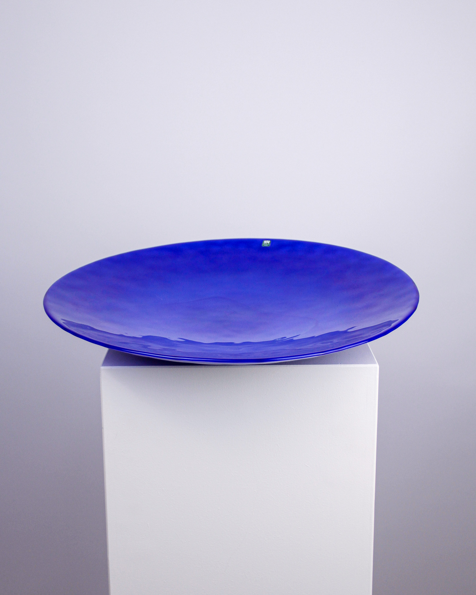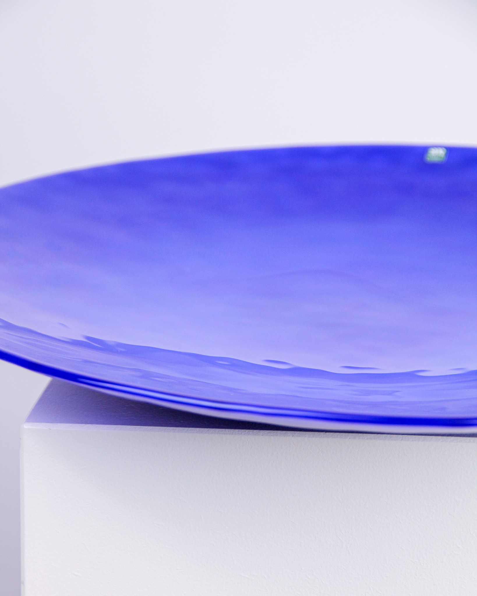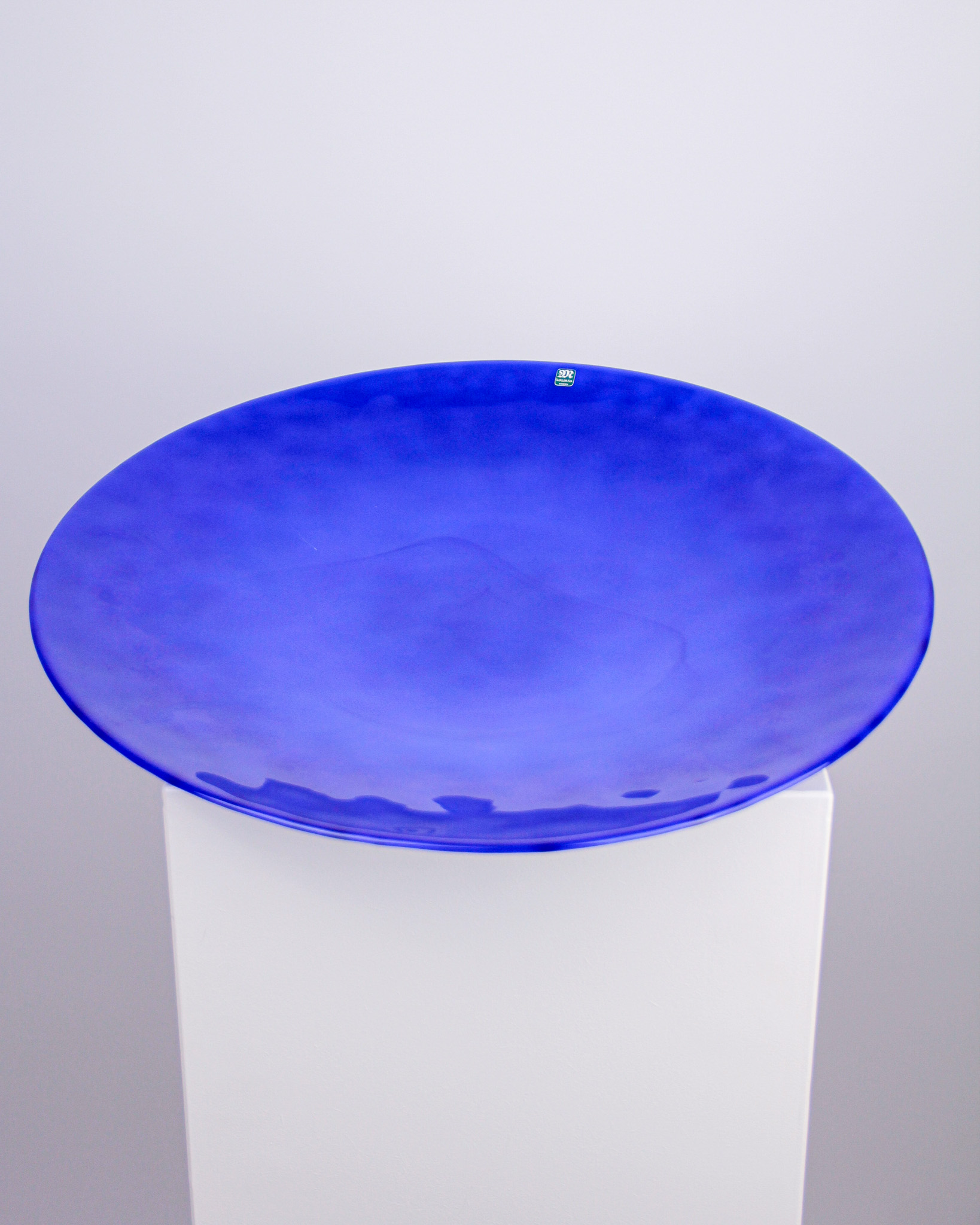 Eva Englund, fat, blÄtt glas, etikettmÀrkt MÄlerÄs Sweden