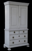 Tvådelat. Vitmålat. Upptill med dubbla dörrar. Nedtill med fyra lådor.