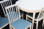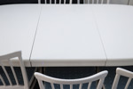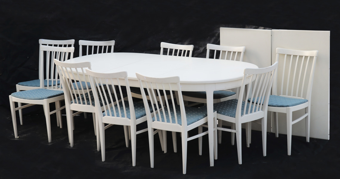 Grålackat. Stolar 10st samt matbord med tre iläggsskivor à 55cm (en med sarg).