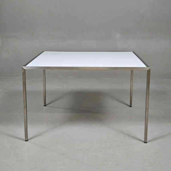 Kvadratisk skiva i vit laminat. Underredet består av ben i borstat stål. Fabrikat okänt.