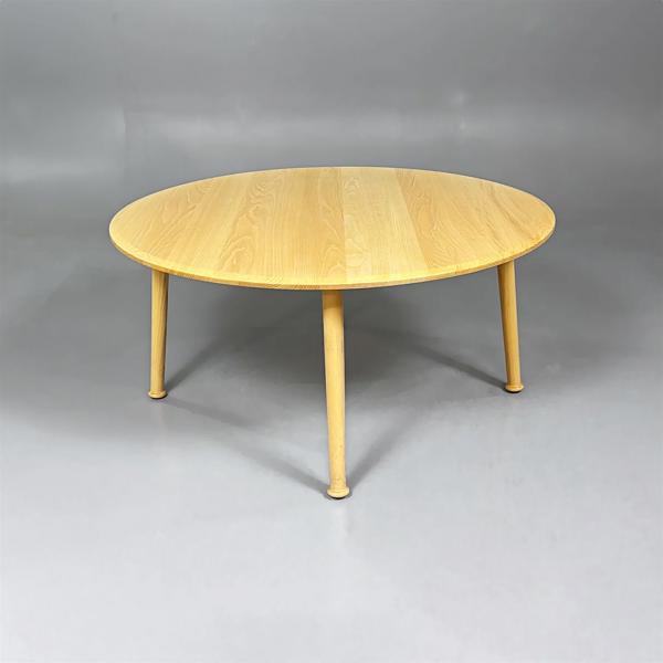Rund bordsskiva i björk med fasad kant och fyra svarvade ben.