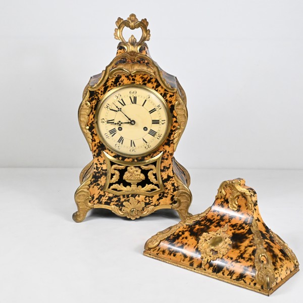 Bordsurets höjd 48, konsolens höjd 17 cm. Boulle-arbete med mässing och sköldpaddsimitation. Emaljerad urtavla.