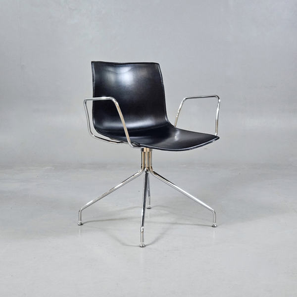Catifa 46 är en stilren snurrstol designad av trion Lievore Altherr Molina för italienska Arper. Stolen är klädd i svart läder med ett underställ och armstöd i krom.