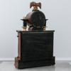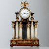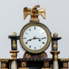 Stomme fanérad i valnöt. Kolonnrad av alabaster med bronserade kapitäl och baser. Beslag av mässing. Rund urtavla med romerska siffror krönt med dekorerande örn.