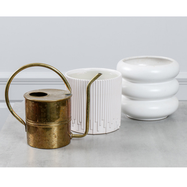 Vattenkanna, mässing, samt 2 st ytterfoder, glaserat lergods, 2000-tal
