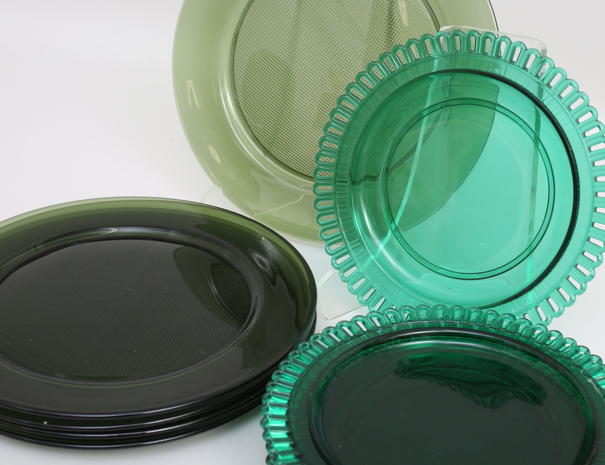 Kjell Blomberg Gullaskruf, grönt glas, diameter 26,5, 6 assietter sannolikt Gullaskruf, grönt glas, diameter 21,5, (11)