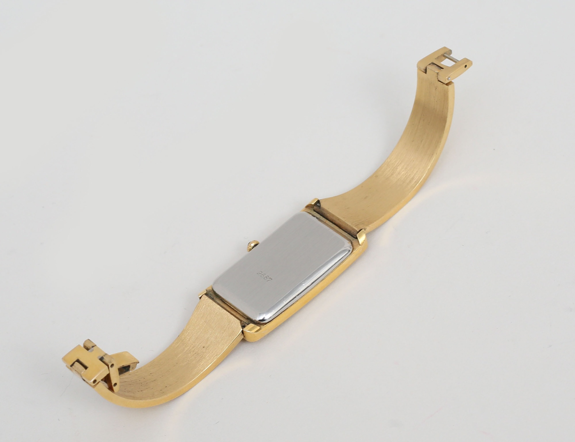 förgyllt, rektangulär urtavla 40x20mm., stelt armband, manuell, fungerar vid katalogiseringstillfället, ref. nr. 2687 (smärre bruksslitage)