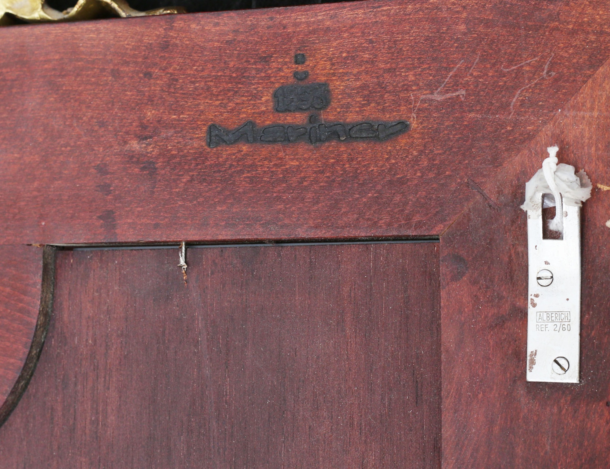 1900-talets andra hälft, mahogny, dekorelement i mässing, infällda bemålade porslinsknappar, profilerad marmorskiva, höjd 94/76, bredd 55/104, djup 35 (2)