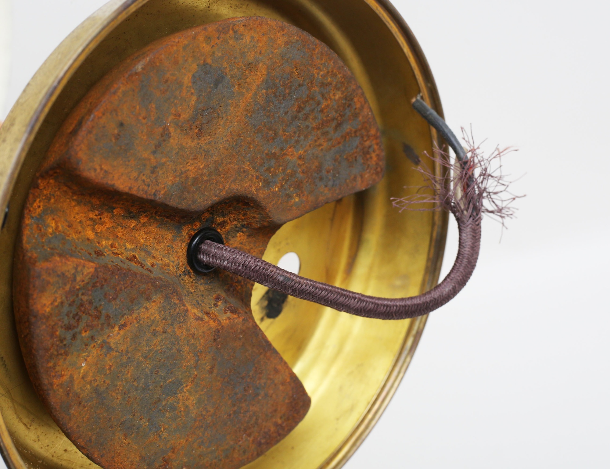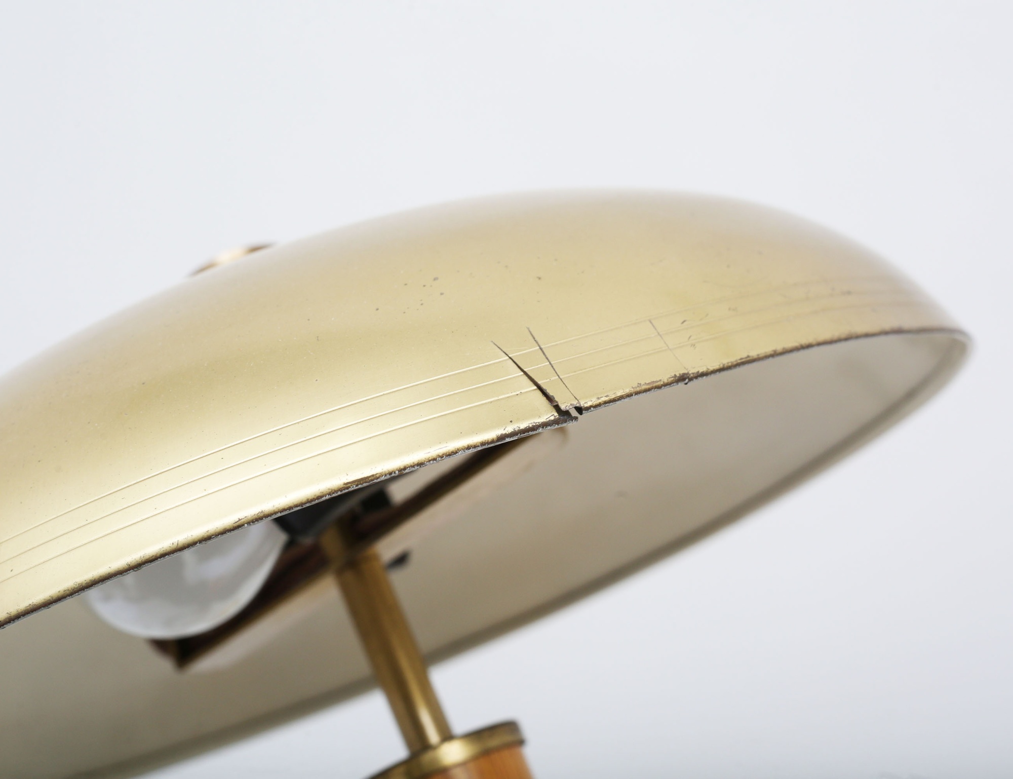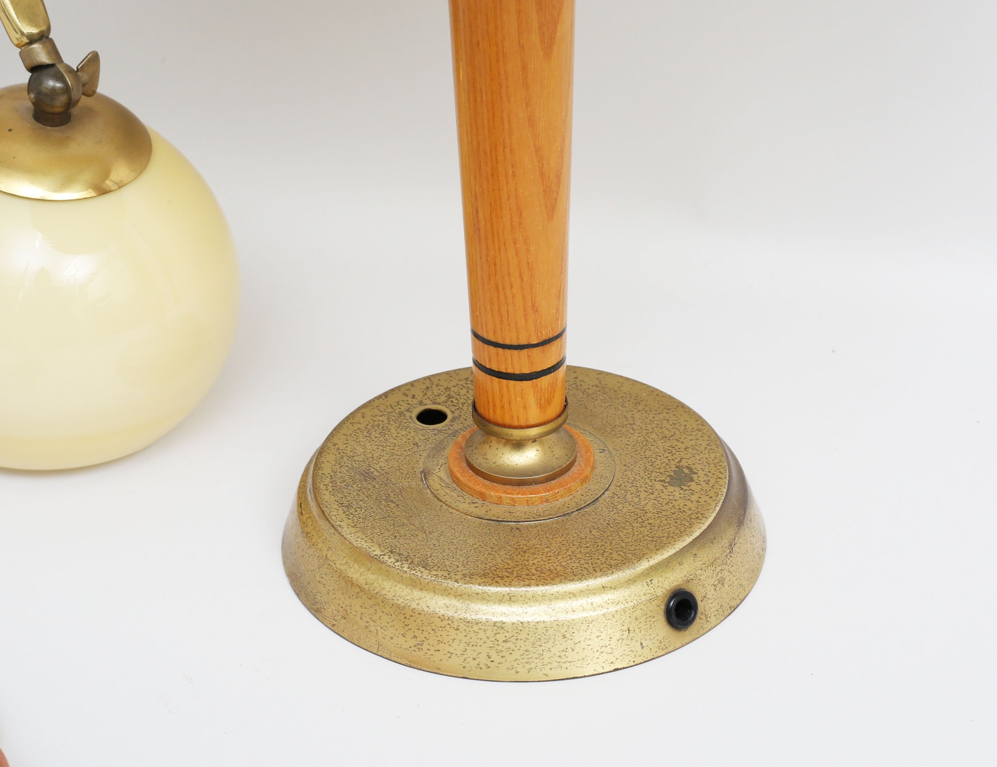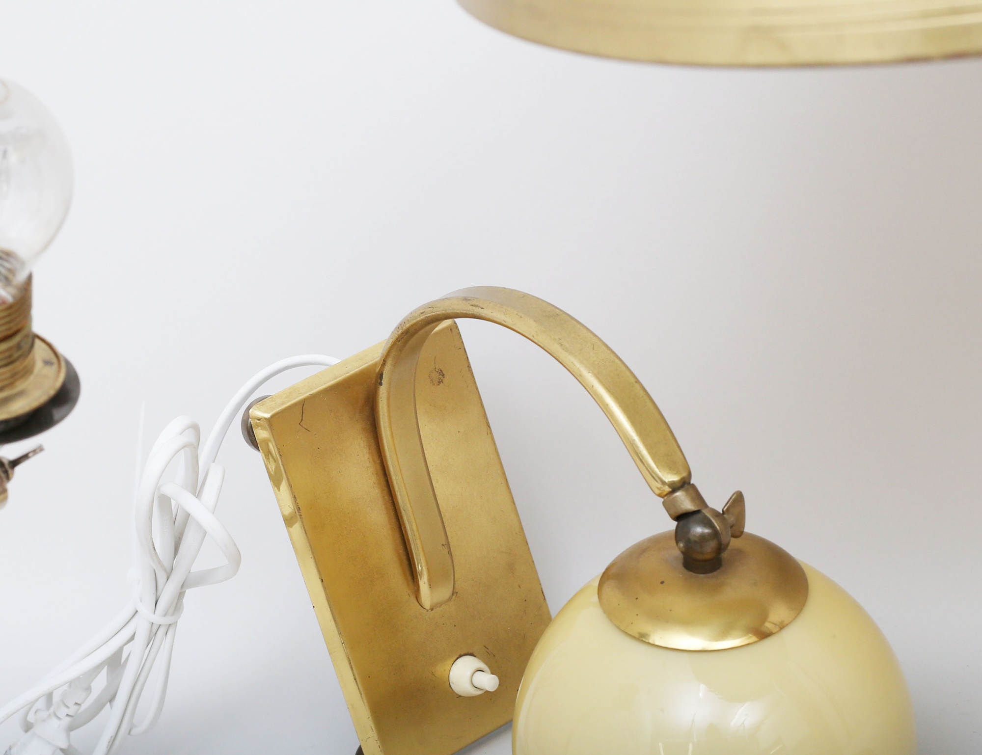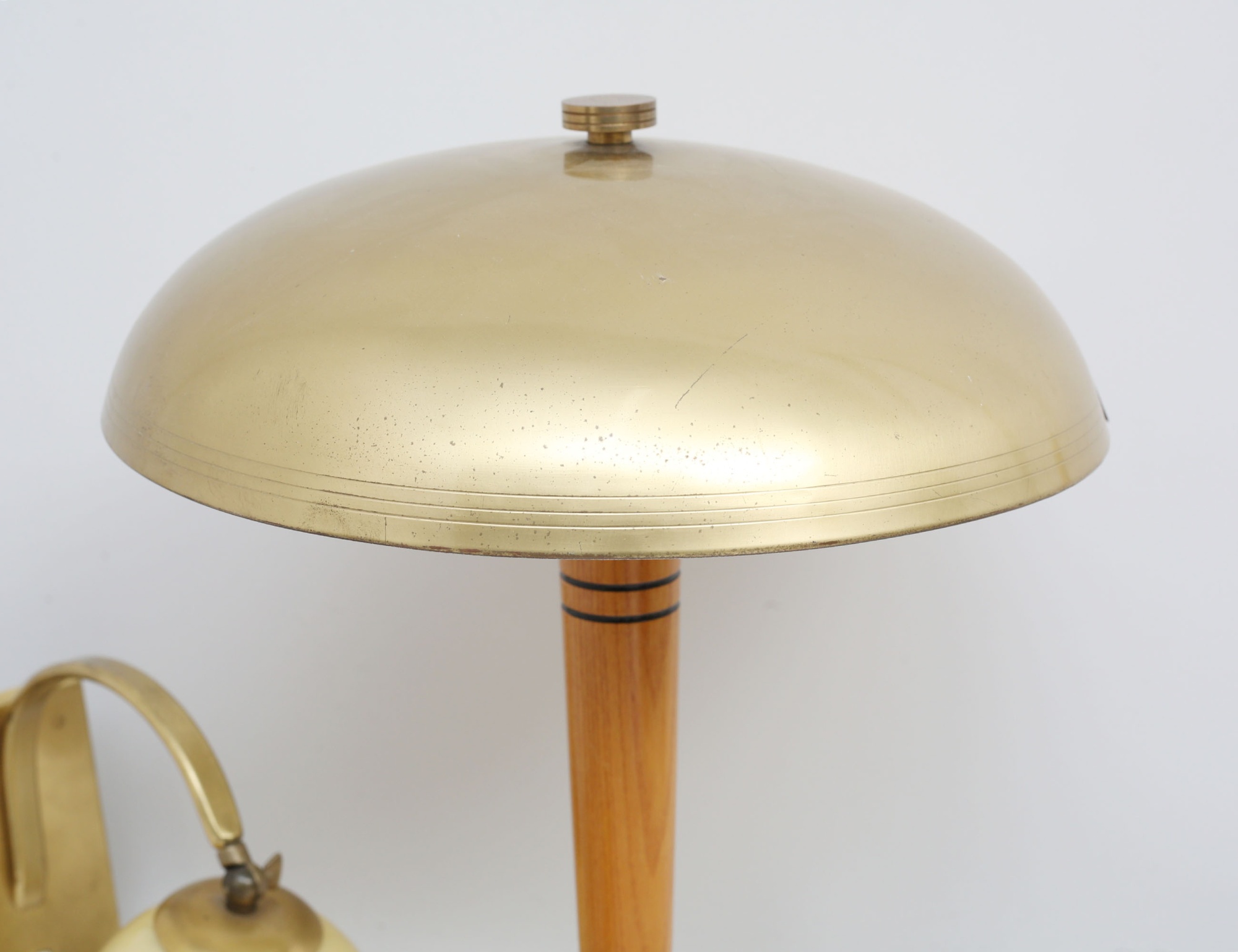 skrivbordslampa lackerad mässing, stam i trä med svart randdekor (strömknapp och elkabel saknas, skärm med spricka), 3 vägglampor varav en i krom, en mässing med lackerad plåtskärm, en mässing med glaskupa (4)