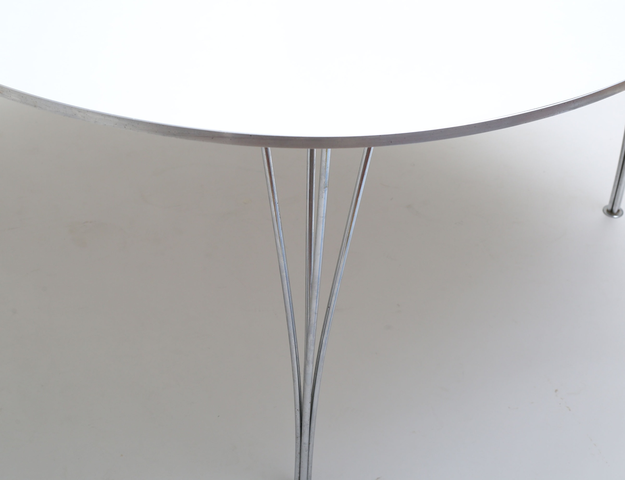 Piet Hein & Bruno Mathsson, Fritz Hansen Danmark 7408, etikettmärkt, vit laminat med aluminiumkant, spännben i krom, höjd 72, diameter 145