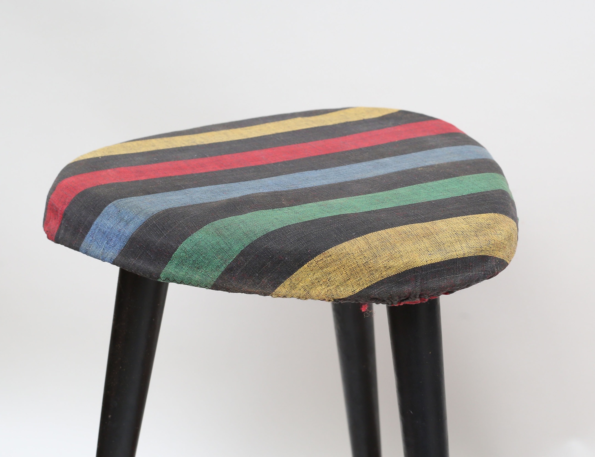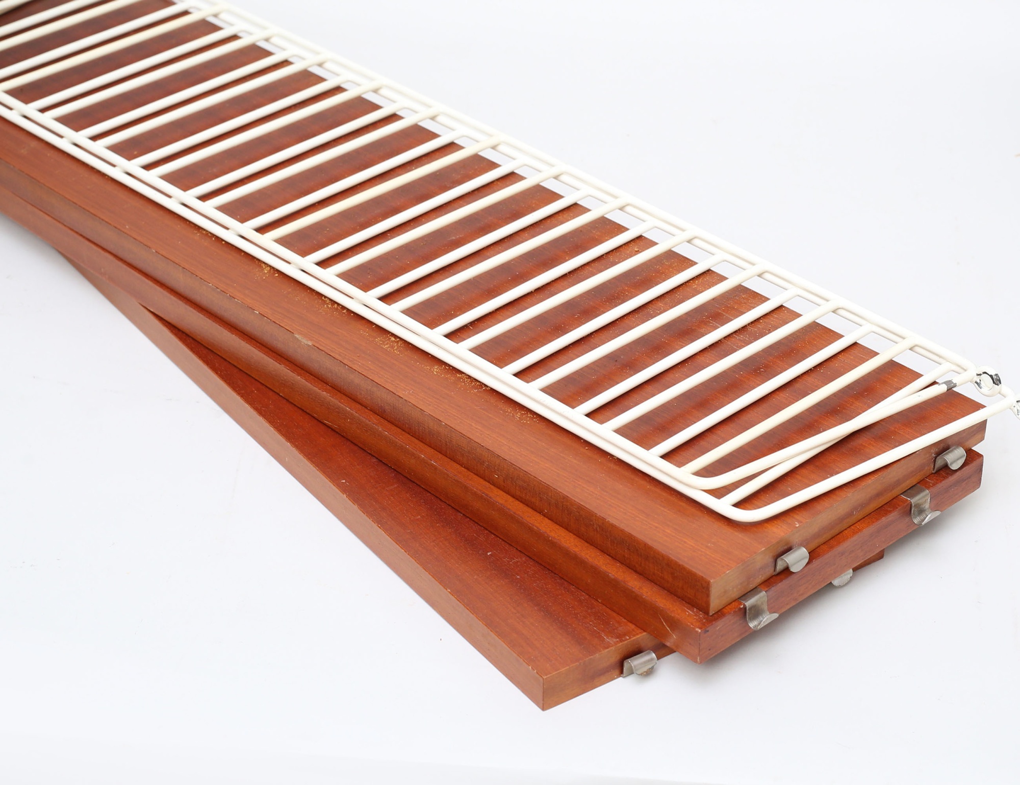 tre hyllplan i teak, konsoler i vit plastöverdragen metall, höjd 75, bredd 78, pall 1960-tal, svartlackerade ben, klädd sits, höjd 43 (torr stoppning) (2)