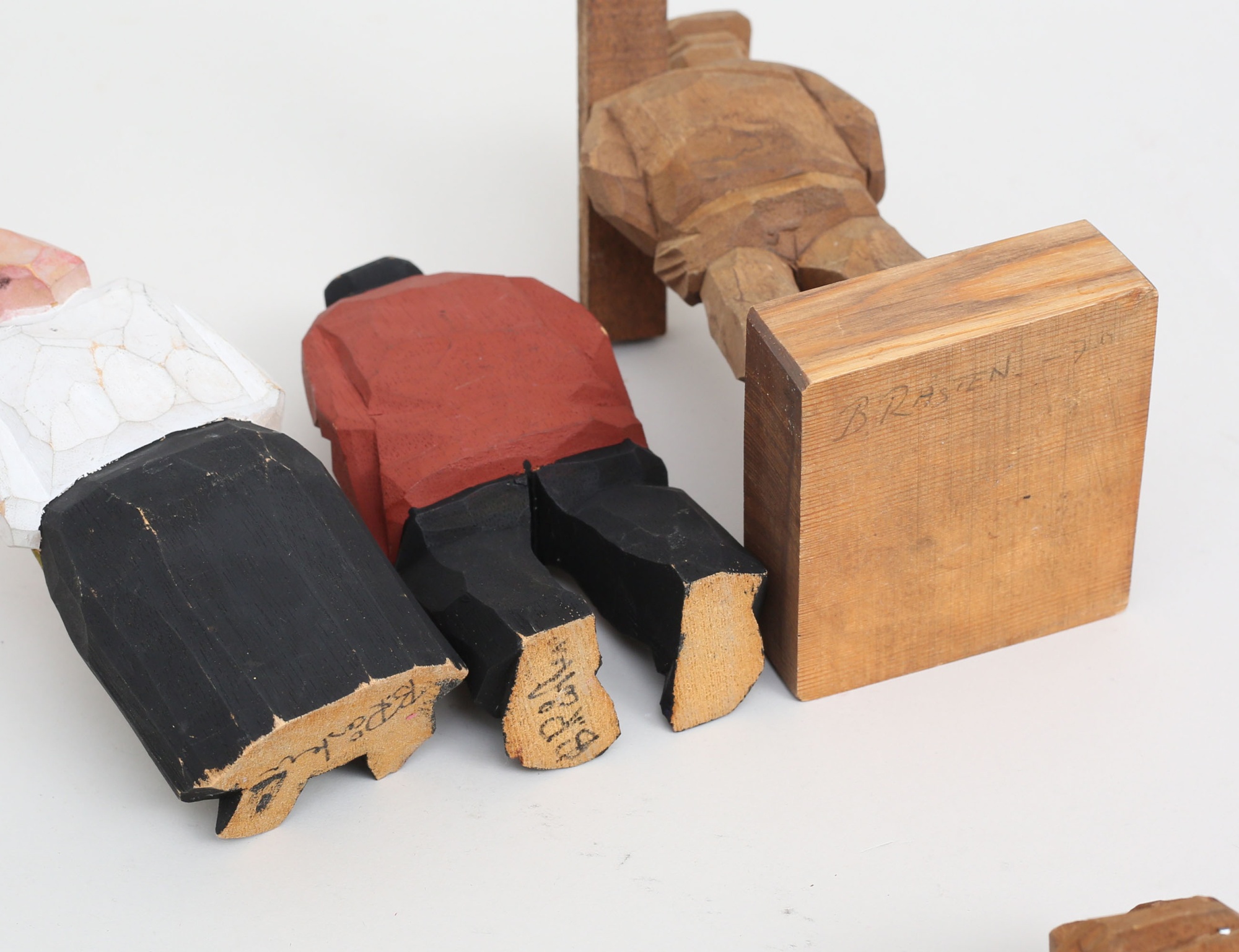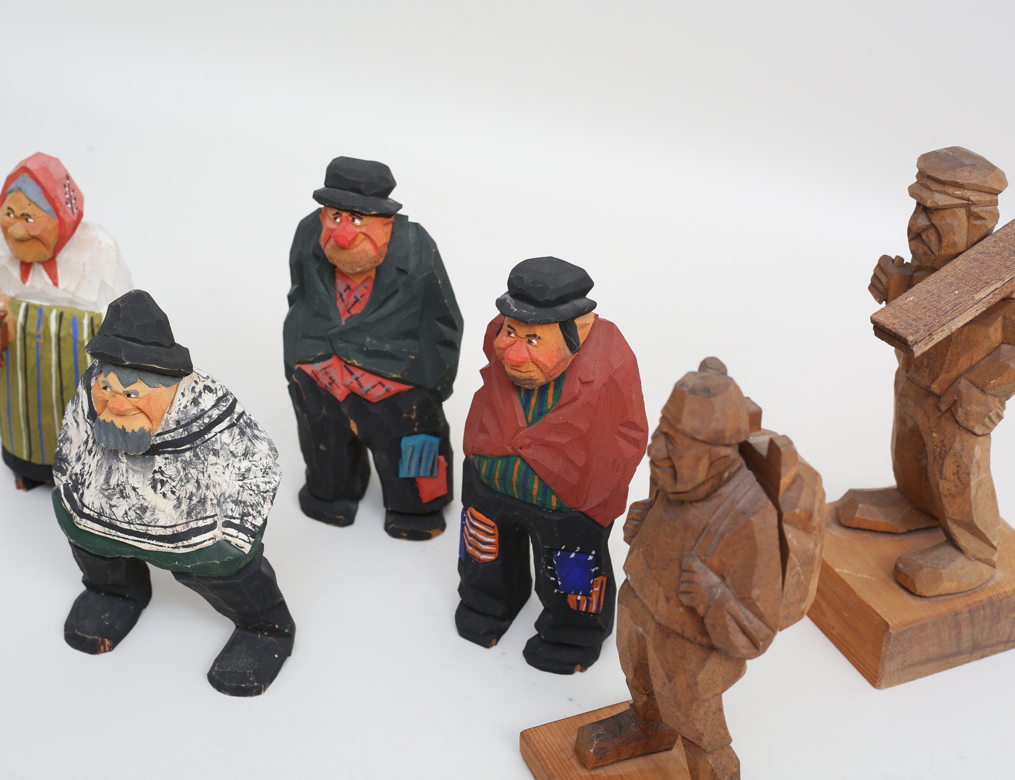 6 träskulpturer delvis bemålade, signerade, 1900-talets andra hälft, höjd 16-21