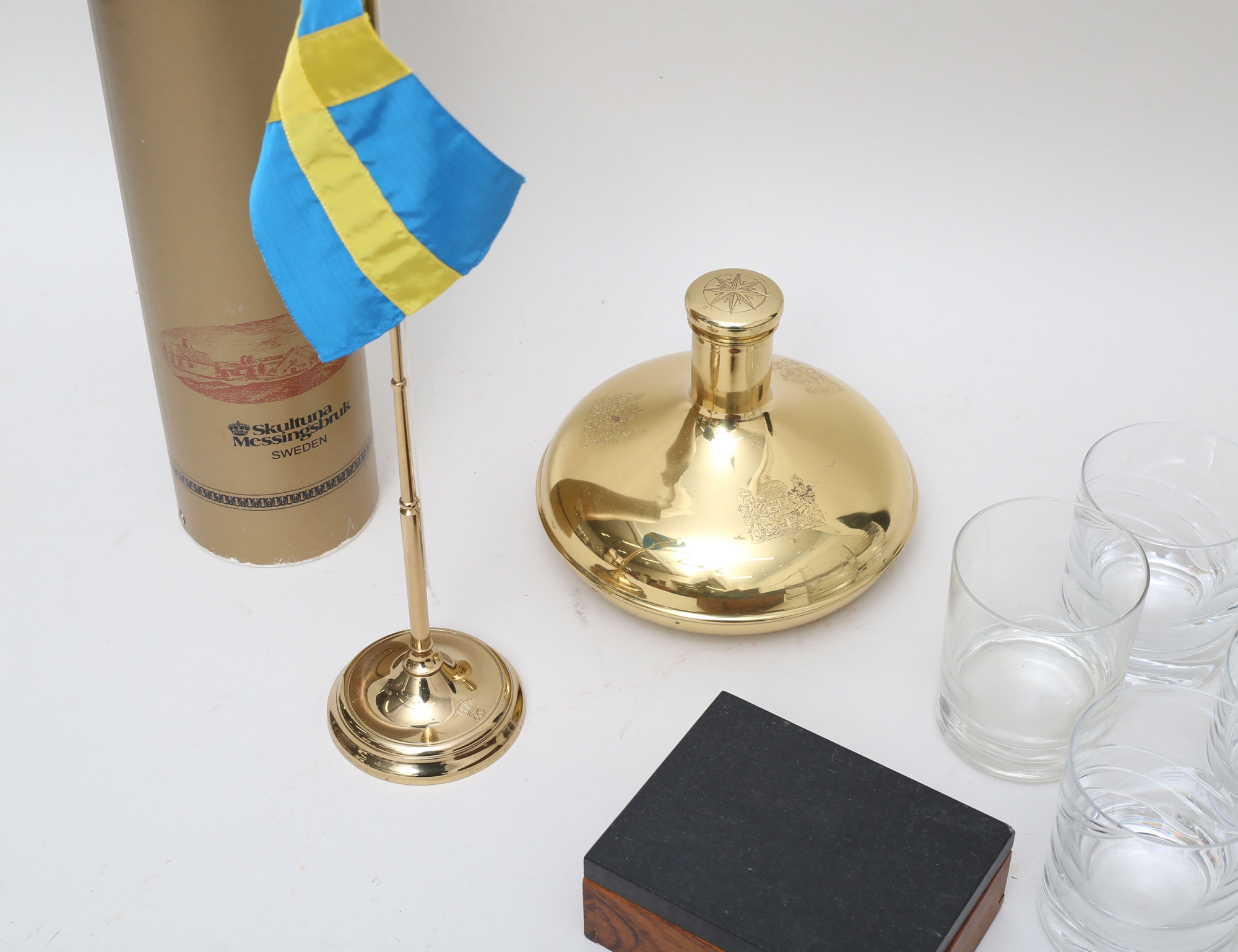 mässing, originalkartong, höjd 40, ask trä med lock i skiffer, 13x10 (lock med smärre nagg), kaptensplunta mässing/glas, Sunwinds Sverige, höjd 14 3+1 whiskyglas, höjd 9