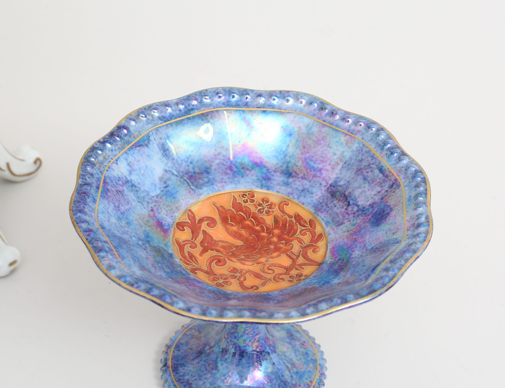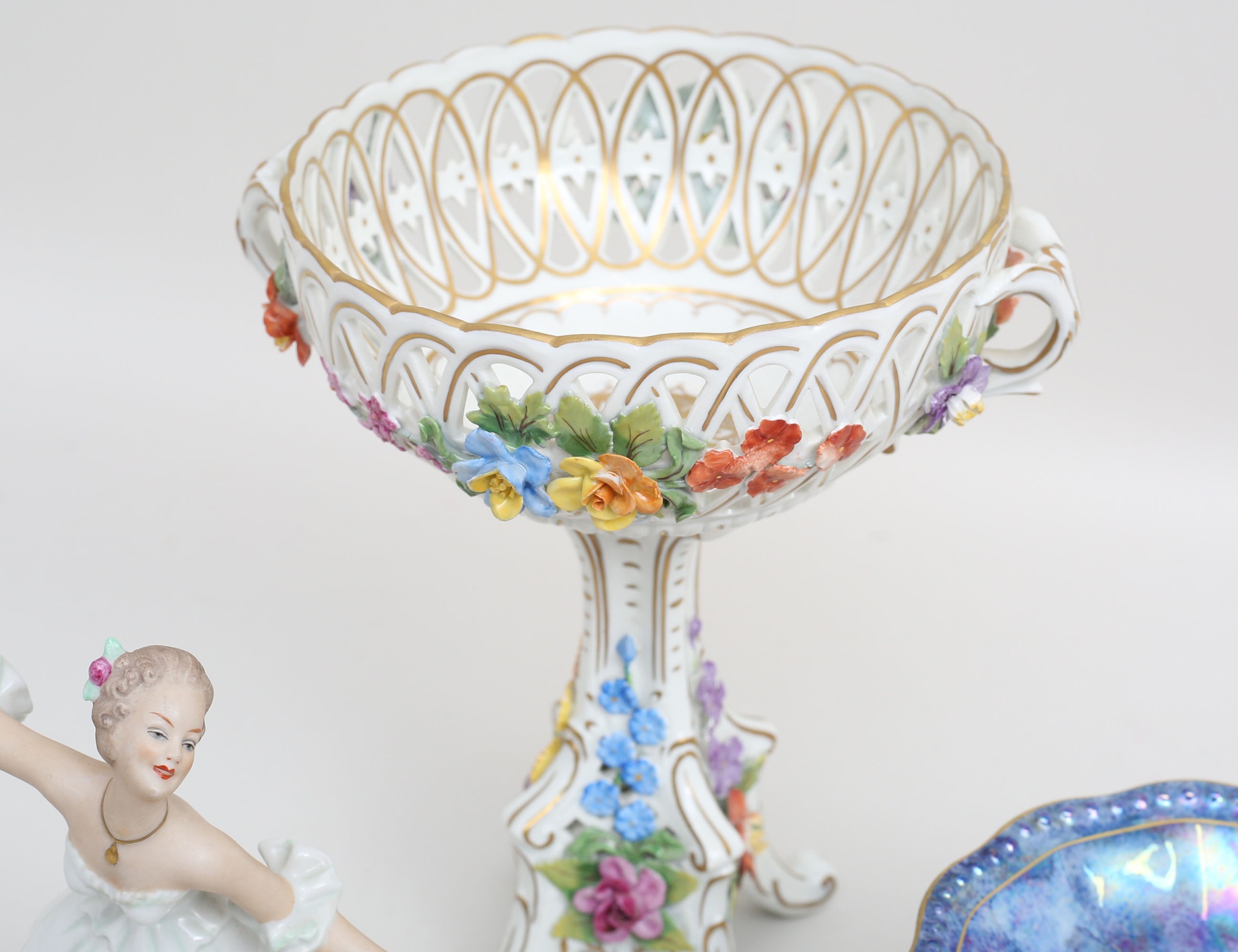 dansande kvinna, höjd 20, skål på fot lysterglasyr, Rosenthal, höjd 110,5, gallerskål på fot Dresden, ströblommor i relief, höjd 24 (3)