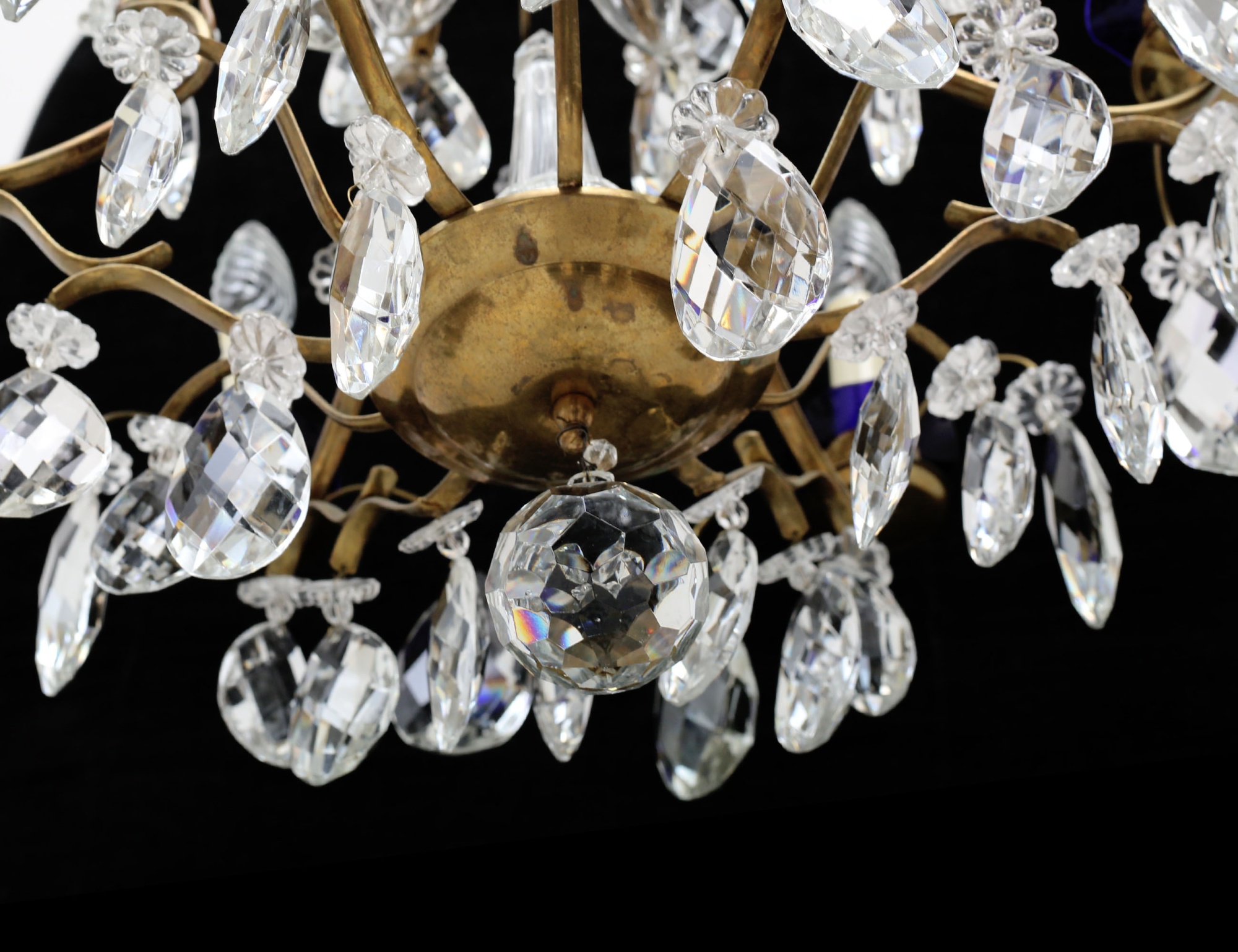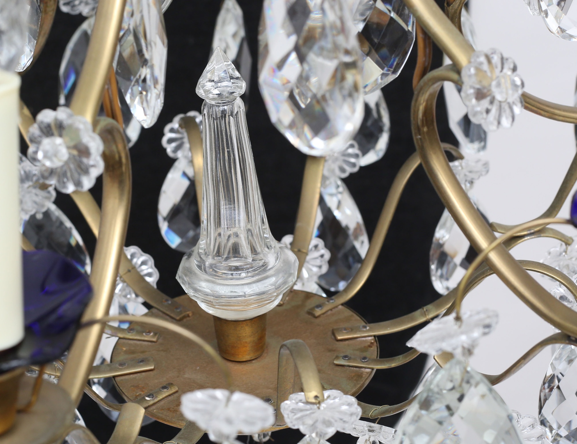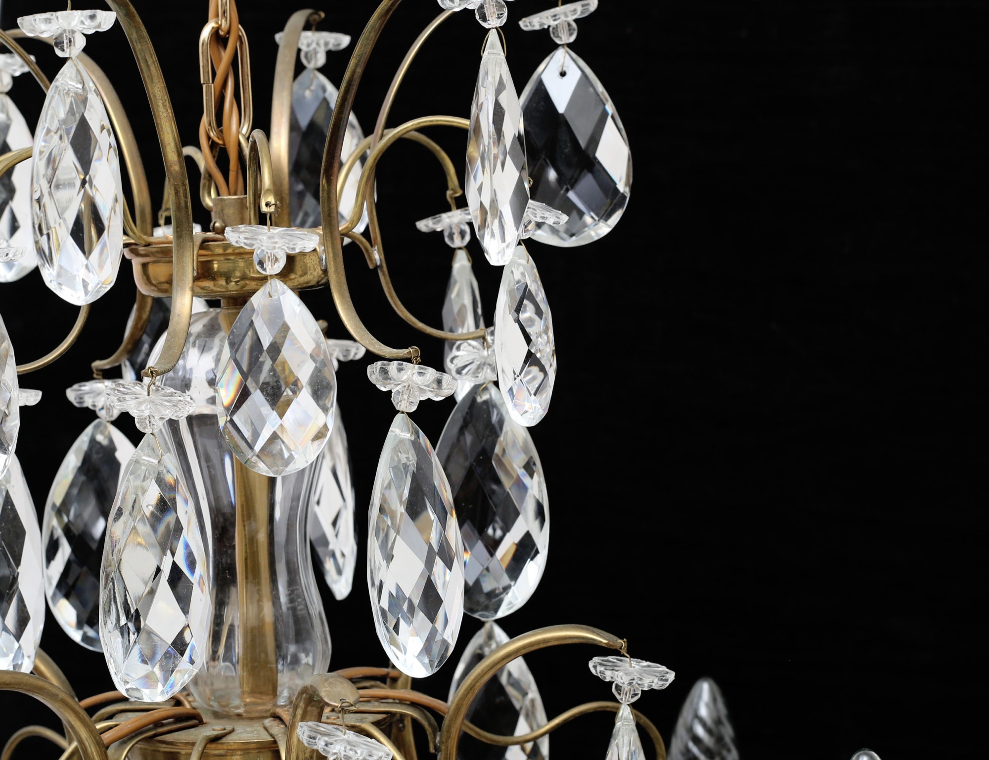 stomme i mässing, fasettslipade droppformade prismor, sex ljusarmar, glasobelisk, höjd 70 (100), diameter 50